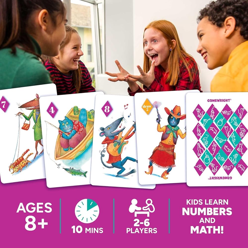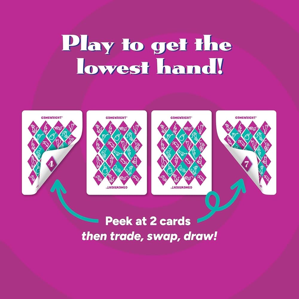 A game of suspense, strategy, and anticipation. Get rid of the high cards (rats) and go for the low cards (cats). Sneak a peek, draw two, or swap cards for an added twist. Low score wins the game. (A poker face helps!)