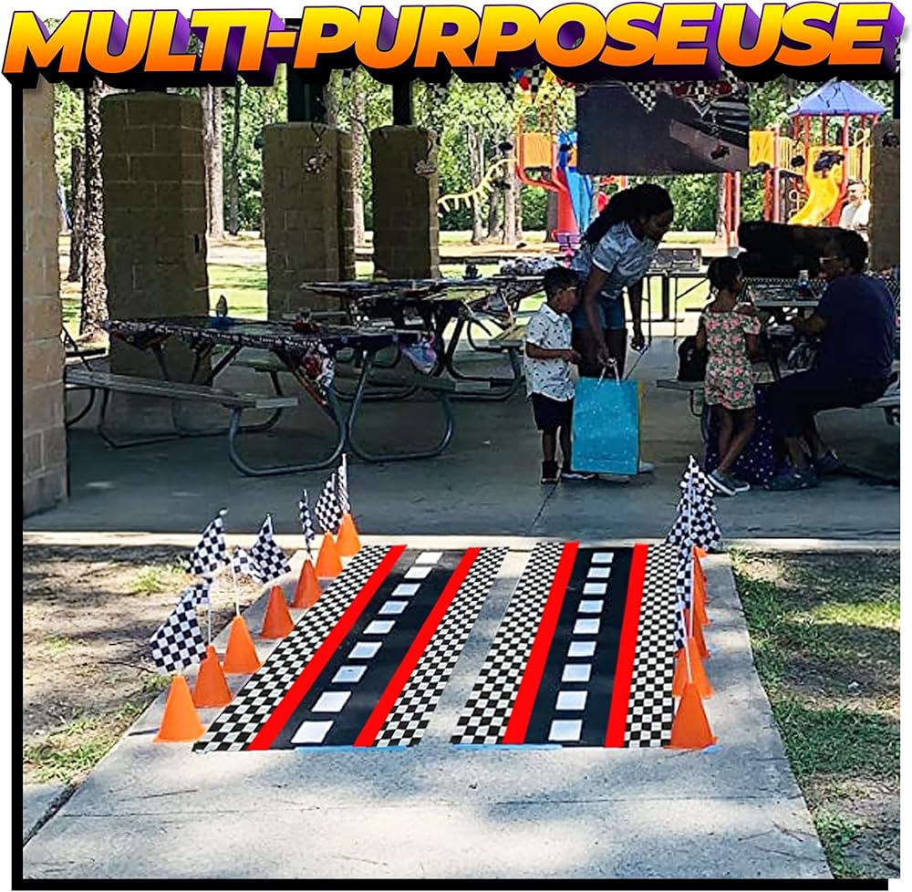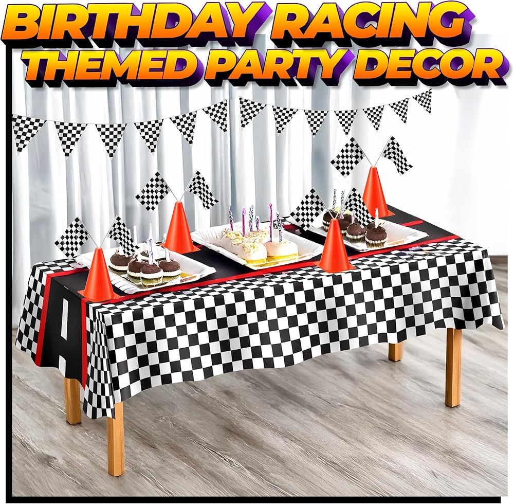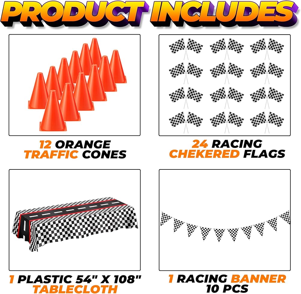 🏁 PERFECT RACING THEMED PARTY DECOR: Kick your race car party into high gear with this traffic cone and checkered flag party pack. Use for easy table decor, racing themed party activities, or creating a finish line for your little speed racers! This set is the perfect addition to any racing themed party.