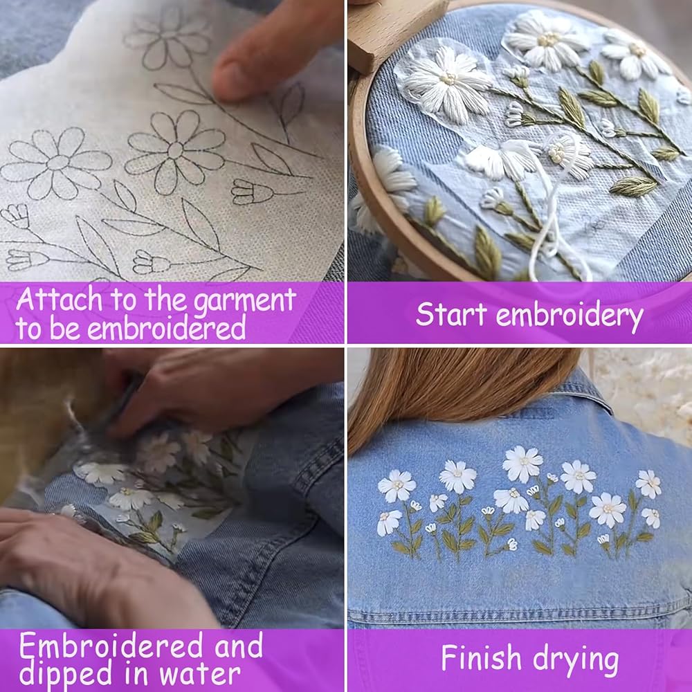 🌟Product Features: our embroidery stickers are made with high-quality water-soluble stabilizers that dissolve easily in water, ensuring a clean embroidery project without any residue. The self-adhesive design of embroidery stickers makes it easy to attach them to your fabric.