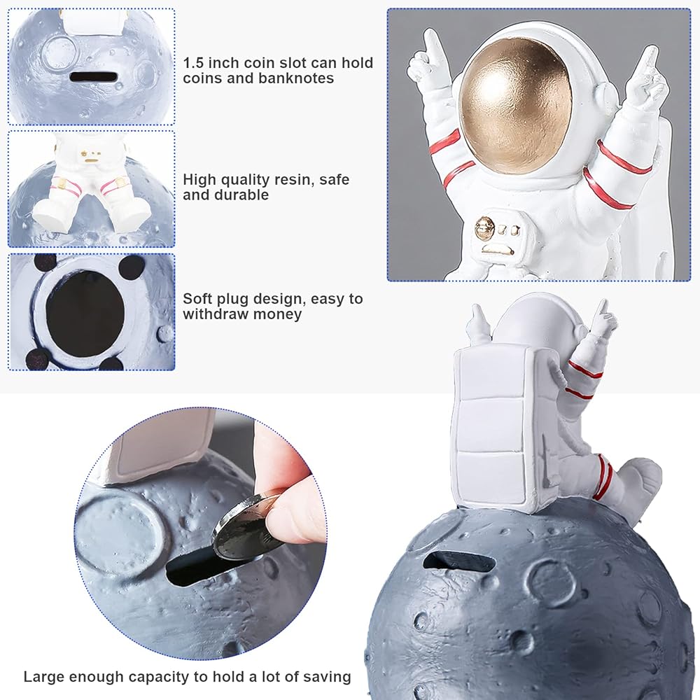 HIGHT QUALITY MATERIAL: The piggy bank for boys and girls astronaut toys are made of high quality resin, coupled with exquisite craftsmanship, hand-painting, simulating the unevenness of the lunar surface, creating a lively astronaut figure astronaut decor and vivid outer space decor.