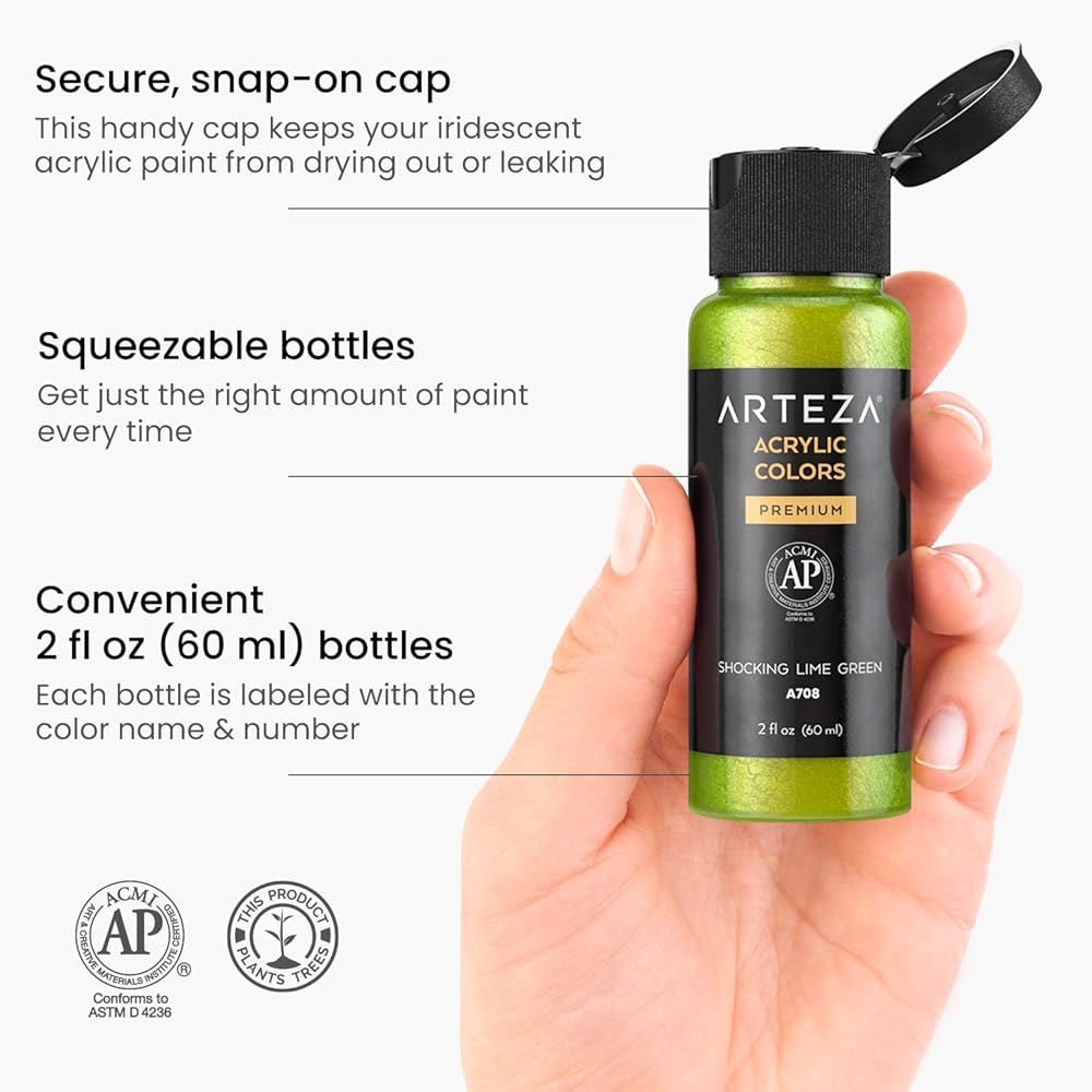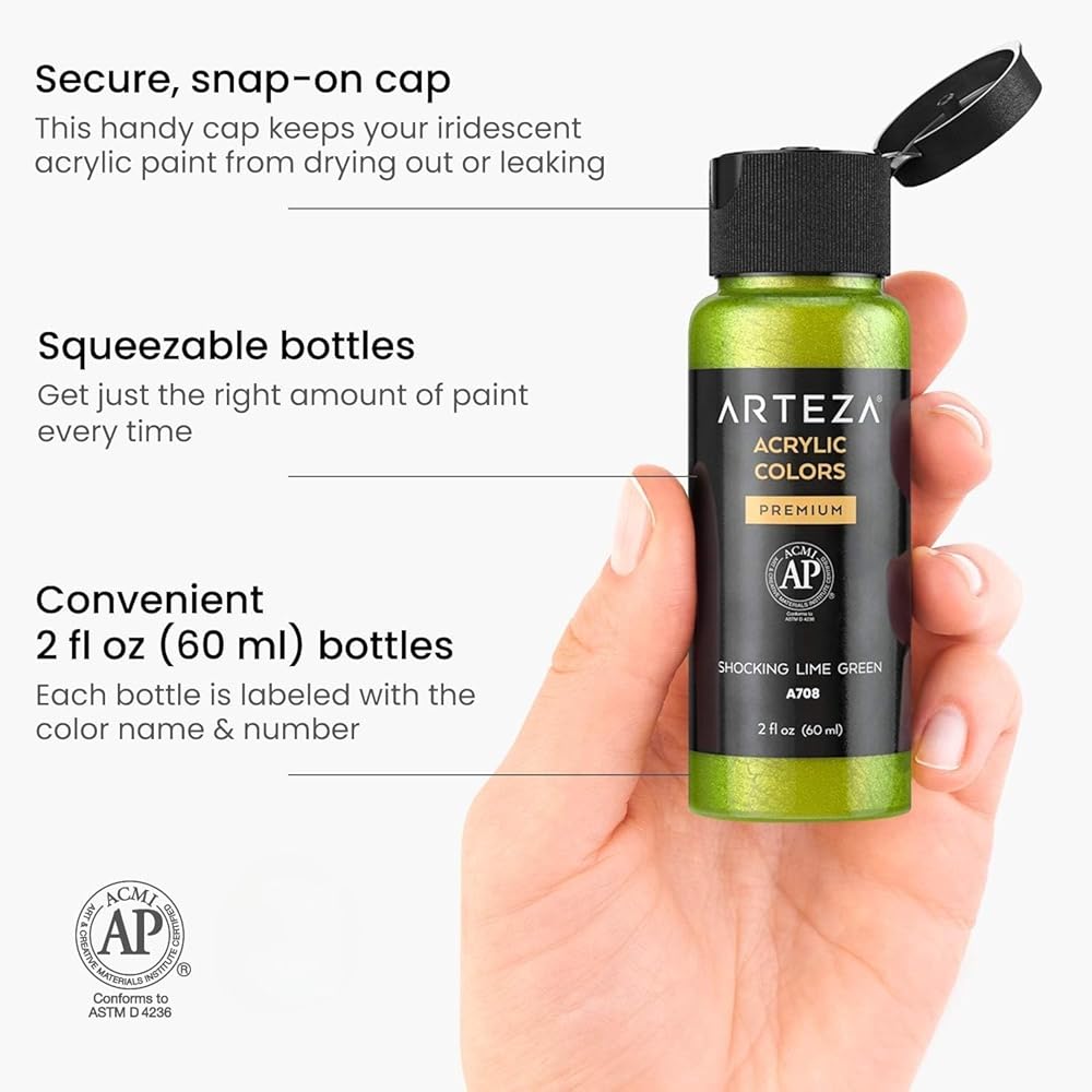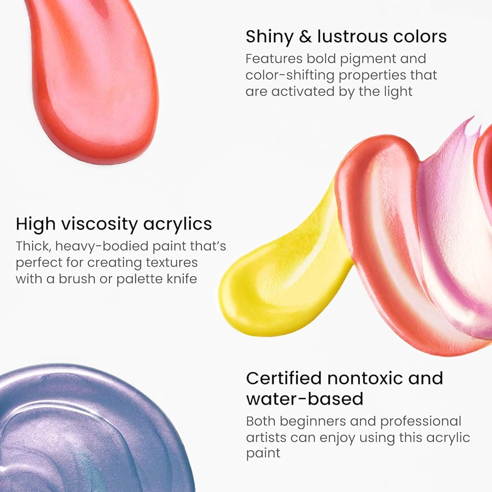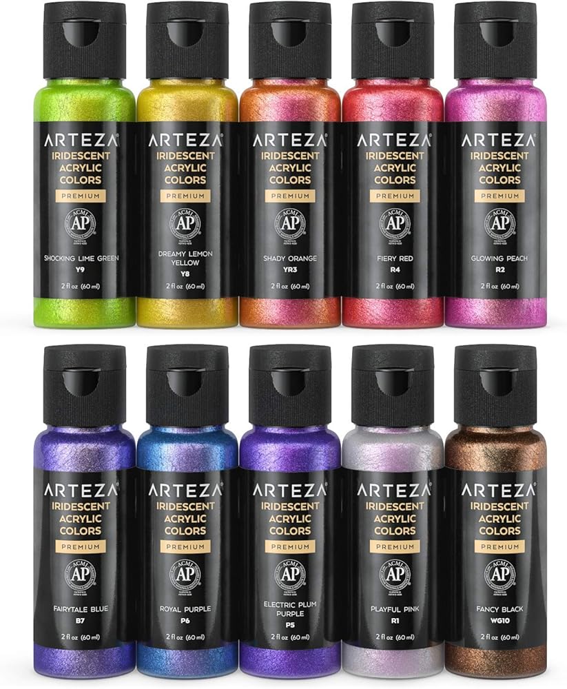 ARTEZA Iridescent Acrylic Paint, Set of 10 Chameleon Colors, 2 oz/60ml Bottles, High Viscosity Shimmer Water-Based, Blendable Paints, Art Supplies for Canvas, Wood, Rocks, Fabrics