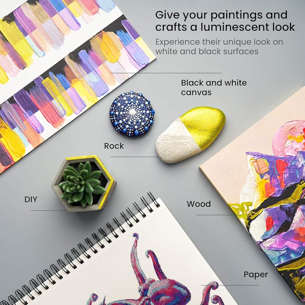 You're not only limited to applying these to canvases; you can use them on wood, rocks, fabrics and paper. These quick-drying paints are water-based and allow you to layer your paints without waiting a long time for everything to dry. You can even combine them with a pouring medium and watch your shimmering paints transform into magical pouring acrylics.