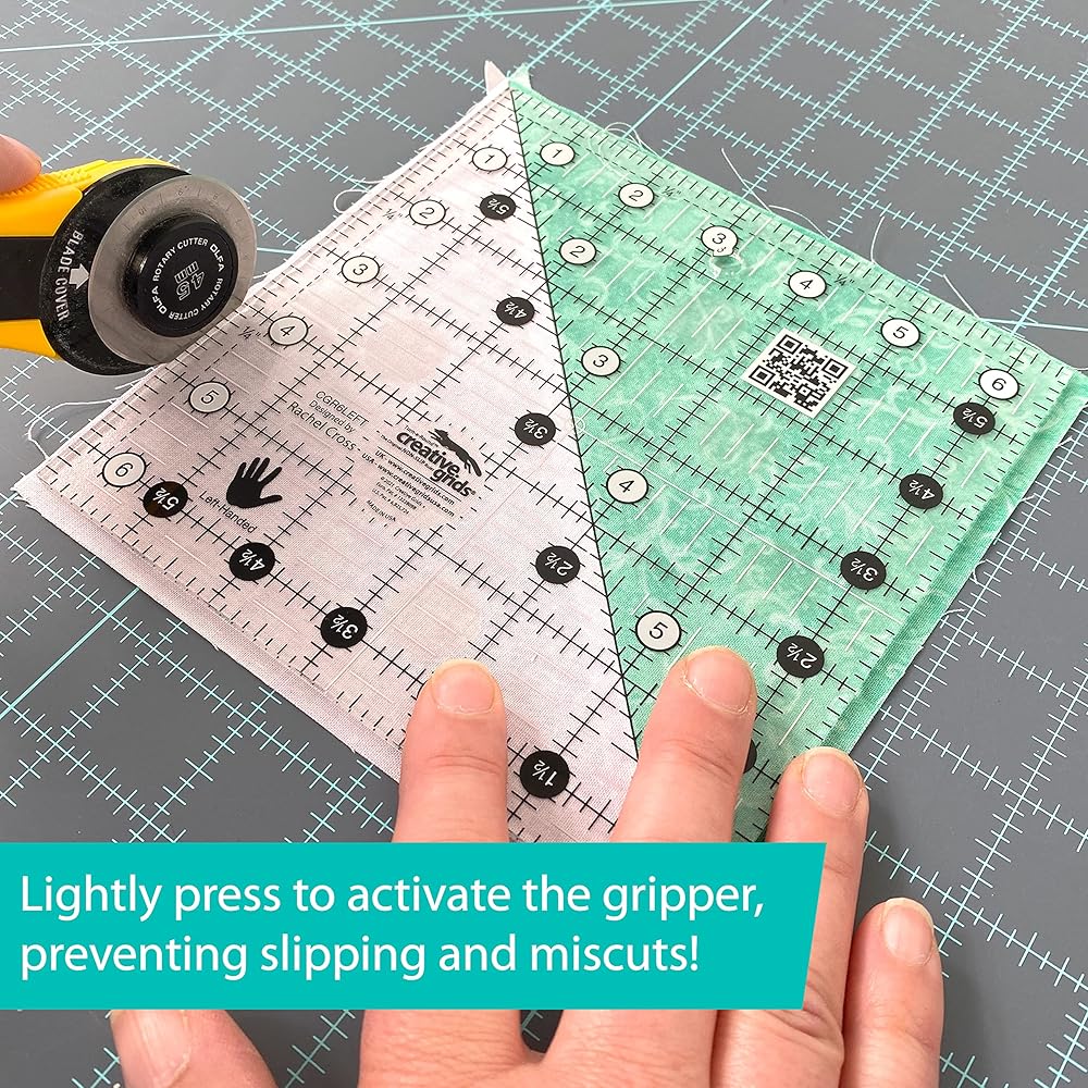 Introducing the first truly left-handed square ruler on the market! Now you can experience all of the great features of the most popular Creative Grids ruler, but printed specifically for lefties! The markings on this 6 1/2 inch square are a mirror image of our right-handed ruler so lefties will no longer have to deal with numbers that are upside down and reversed! This 6-1/2 square ruler features easy-to-read black and white markings printed in 1 inch grids marked in 1/8 and 1/4 inch increments. Use the easy-to-read, black numbers (printed on white dots) and the 1/4 inch grip sides to cut whole inches. The 1/4 inch dashed lines printed on two adjoining sides aid in trimming seam allowances. Use the patented Turn-A-Round feature â designated by the easy to read, numerical white numbers (printed on black dots) and the 1/2 inch grip sides â to add the 1/2 inch seam allowance. A 45 degree angle is printed in black and is used to trim half-square triangles to size. White horizontal and vertical lines are printed on the square so the center of the ruler is easily distinguishable. Use these lines to square up blocks based on four-patches or embroidered and appliqued blocks. The ruler slides easily over the fabric until pressure is applied. Then, our exclusive gripper holds the fabric in place while cutting, eliminating slipping and miss-cuts! Scan the QR Code printed on the ruler to view a tutorial of these features. This left-handed option is also available as a 6-1/2 x 24-1/2 inch rectangle (CGR24LEFT). Total Size - 6-1/2in x 6-1/2inÂ