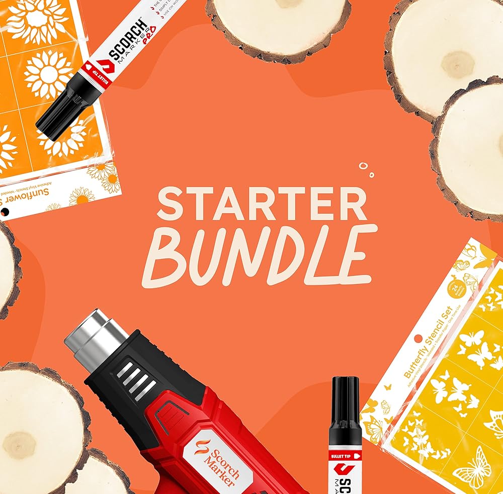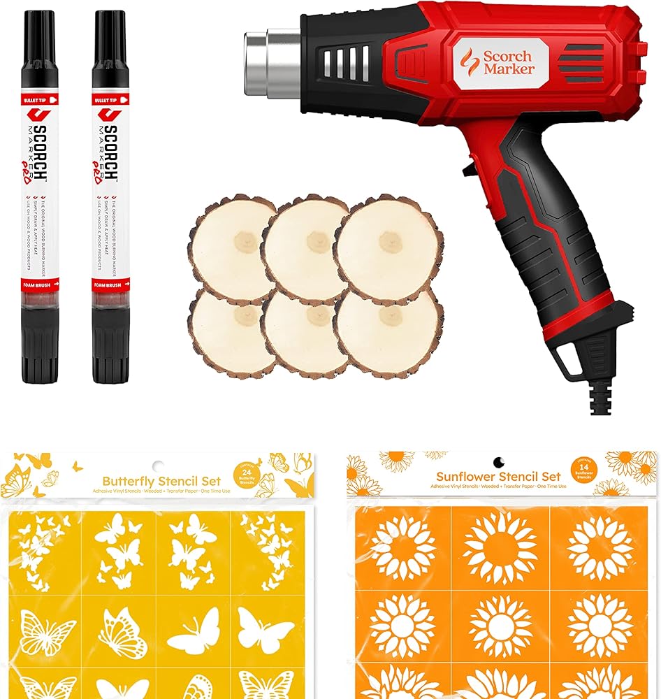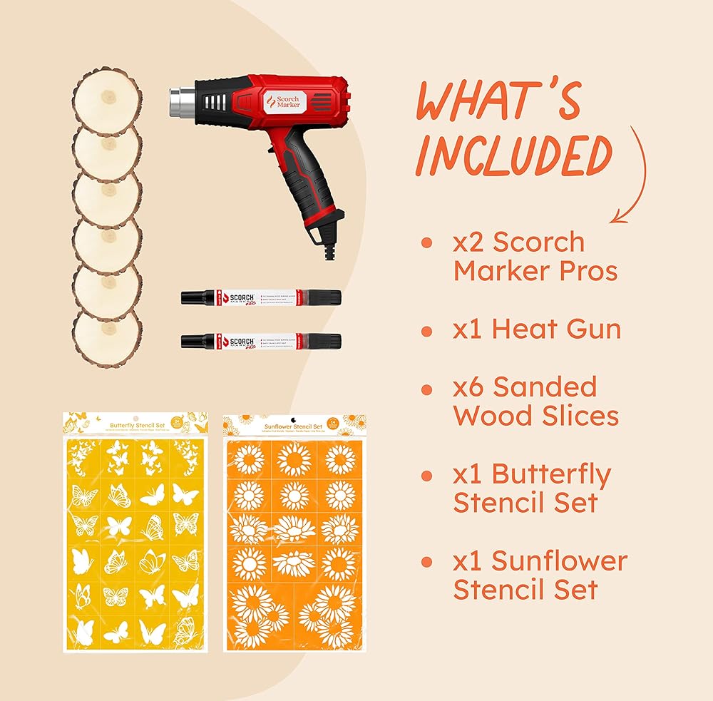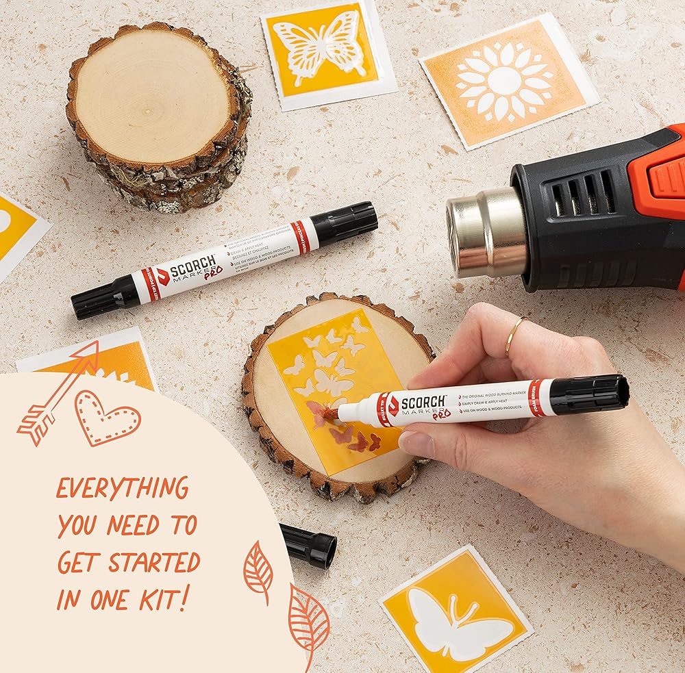 Here at Scorch Marker we strive to ensure that wood burning and crafts are easy and accessible to the entire crafting community. With our Advanced Creator Bundle, you can more easily make intricate and beautiful designs with your crafts. Empowering you to create and design anything! This DIY set includes 2 Scorch Marker Pros, a 1500 Watt Heat Gun, 10 sourwood slices, 2 Vinyl Stencil Packs, Coconut Wood Finish and a Sanding Kit. This all-inclusive crafting assortment gives you everything you need from start to finish, to bring your original designs to life. Just press the tip of the Scorch Marker into a paper towel to prep it, and then you're ready to draw. You can make ornaments, coasters, cards, art projects and much more with this crafting assortment. If you don't want to draw your own designs, try using our stencils. They make it easier than ever to do intricate designs. Each Scorch Marker includes a felt pen side and a brush side, so you can cover large areas. Once you're done drawing, heat the design to 350 degrees Fahrenheit. You can use our heat gun or even put it in the oven! With these wood burning supplies, you'll make fantastic pieces every time.