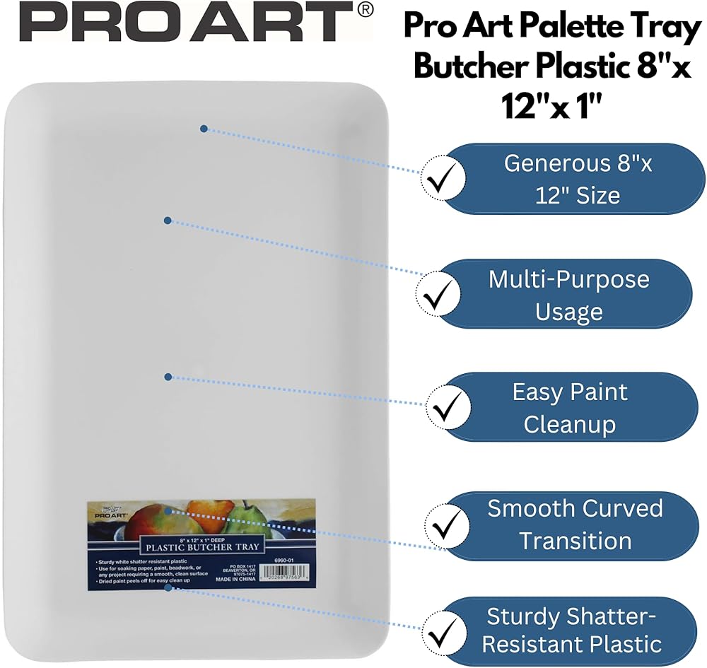 Pro Art Palette Plastic Butcher Tray 11"x 15"- Sturdy, shatter resistant, white plastic butcher tray. Use for soaking paper, paint, beadwork, or any project requiring a smooth, clean surface. Dried paint peels off for easy clean up. Measures approximately 11"x 15. 5".