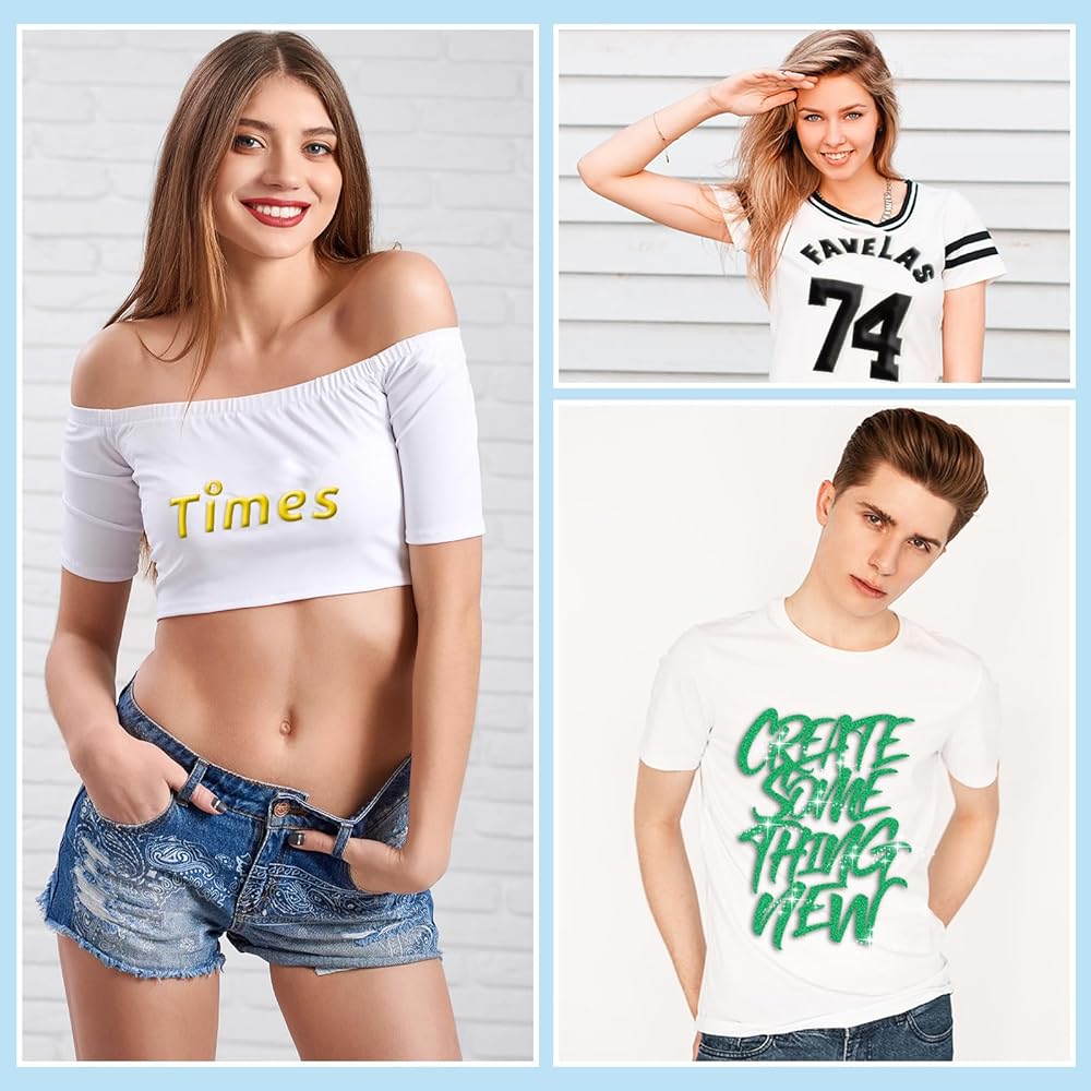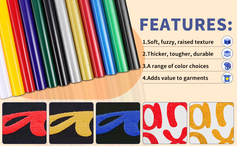 【2 Styles, 3D Embossed】: The 3D puff heat transfer vinyl comes in fun and vibrant colors and two styles, solid and glitter. The solid style has a slightly raised 3D embossed effect after the transfer, while the glitter style shines brightly and looks cool after the transfer.