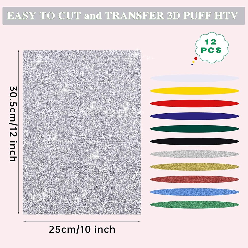 12 Pcs 3D Puff Print Heat Transfer Vinyl - Glitter Multi-Color Puff HTV Iron on Heat Transfer Vinyl for Heat Press T-Shirt Clothes Hats Compatible with Cricut Air or Maker (Assorted Color, 10"x12")