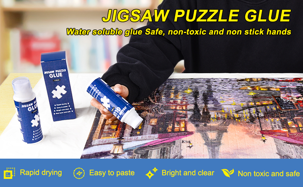 EASY TO USE: Pull out the cap, squeeze out the glue, spread evenly on the puzzle through the sponge tip, let the glue seep into the gap of the puzzle and stick, dry for 1-2 hours and apply to the back.