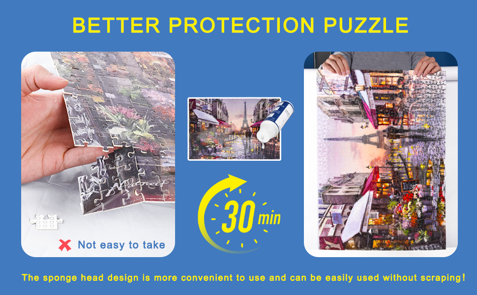 UPGRADE KIT: Sponge head design, easy to use and apply. The puzzle glue formula has been improved to make the puzzles more glossy. It is equipped with high-quality packaging plastic paper, which can not only hold the puzzle well, but also apply puzzle glue directly on it, and the plastic paper and the puzzle will not be glued to destroy the puzzle.