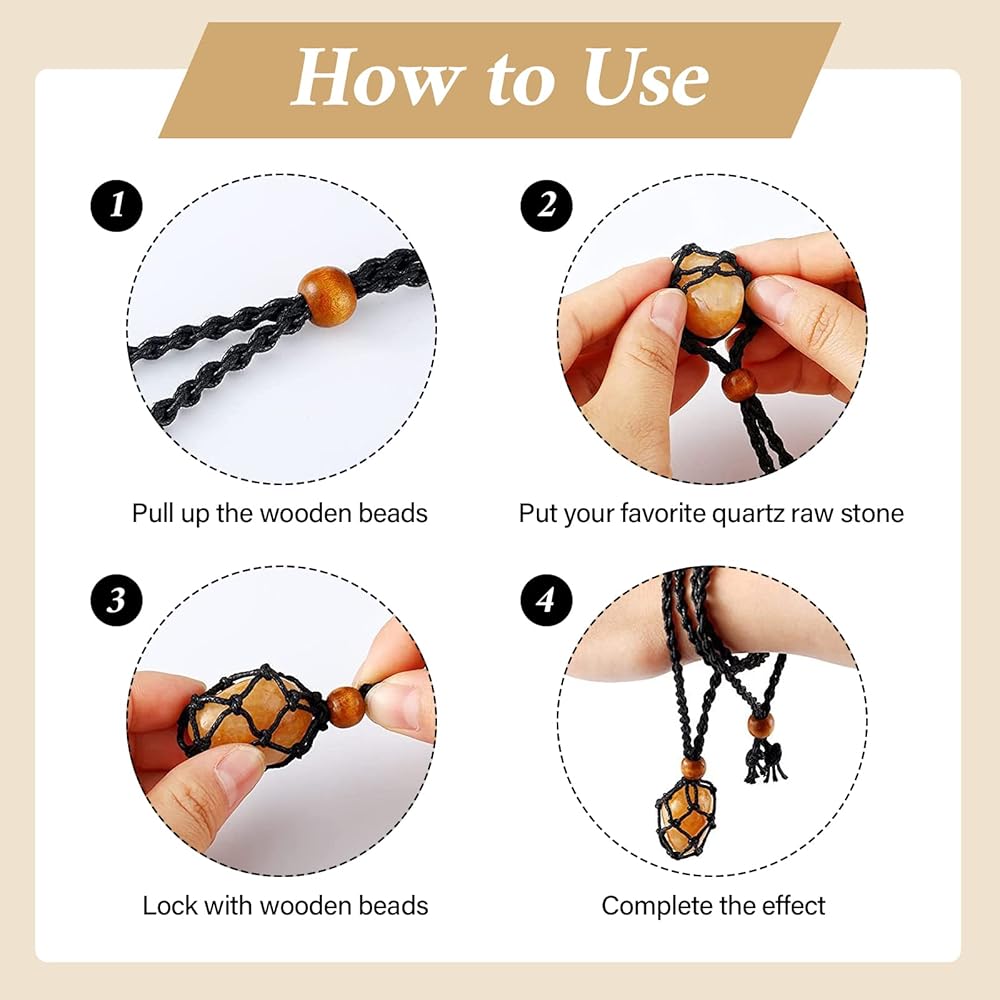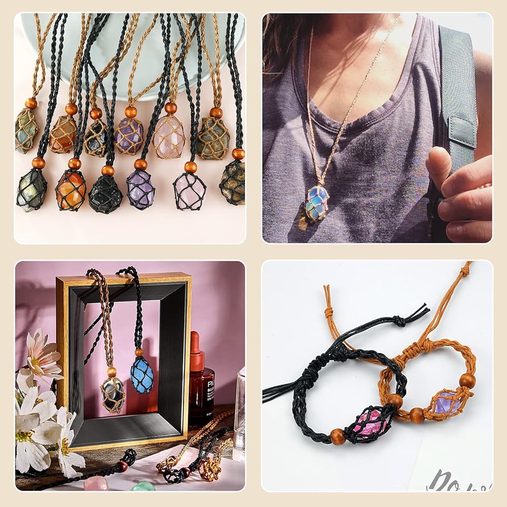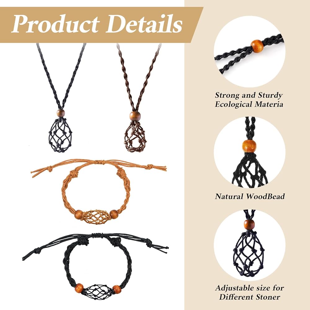4 Pcs Adjustable Cage Necklace Cord, Empty Stone Holder for DIY Jewelry Making, Hand-Woven Crystal Pendant Replacement Rope, Black & Brown, Fish Netted Design for Quartz & Gemstones