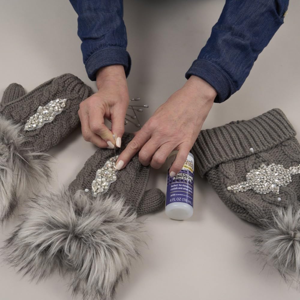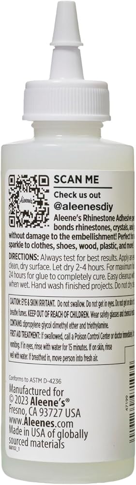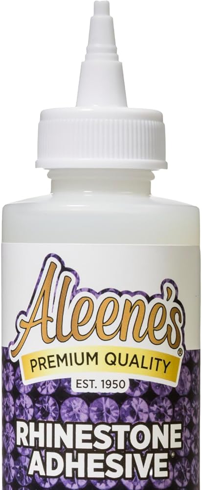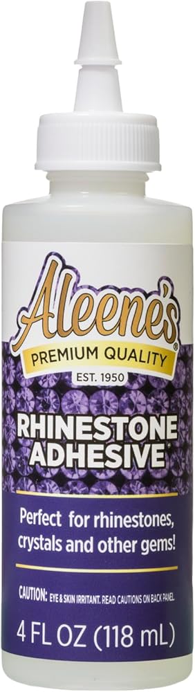 Aleene's Rhinestone Adhesive permanently adheres hard-to-hold rhinestones and embellishments to your next crafting project. This multi-surface adhesive dries clear, flexible and permanent, and won't damage or tarnish embellishments. Use it to adhere jewels, crystals, rhinestones, and more to add some sparkle to all of your projects! Aleene's Rhinestone Adhesive permanently adheres hard-to-hold rhinestones and embellishments to your next crafting project. Use this industrial-strength adhesive on a variety of surfaces such as wood, plastic, shoes, and clothing. This multi-surface adhesive dries clear, flexible and permanent, and won't damage or tarnish embellishments. Use it to adhere jewels, crystals, rhinestones, and more to add some sparkle to all of your projects! Features 1 (4 fl. oz.) bottle of Aleene's Rhinestone Adhesive.