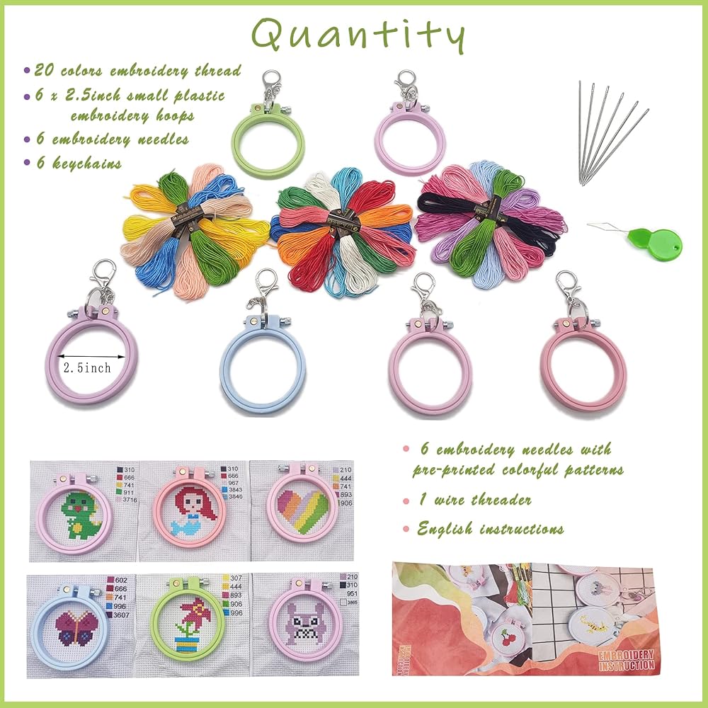🌼【Value-for-money package】 Package includes 6 patterns of embroidery fabric, 6 colored plastic embroidery hoops 2.5inch, 1 pack of soft embroidery thread (enough and extra), 6 pieces key ring,6 needles, a needle threader and English instructions. With these, you can create beautiful art.