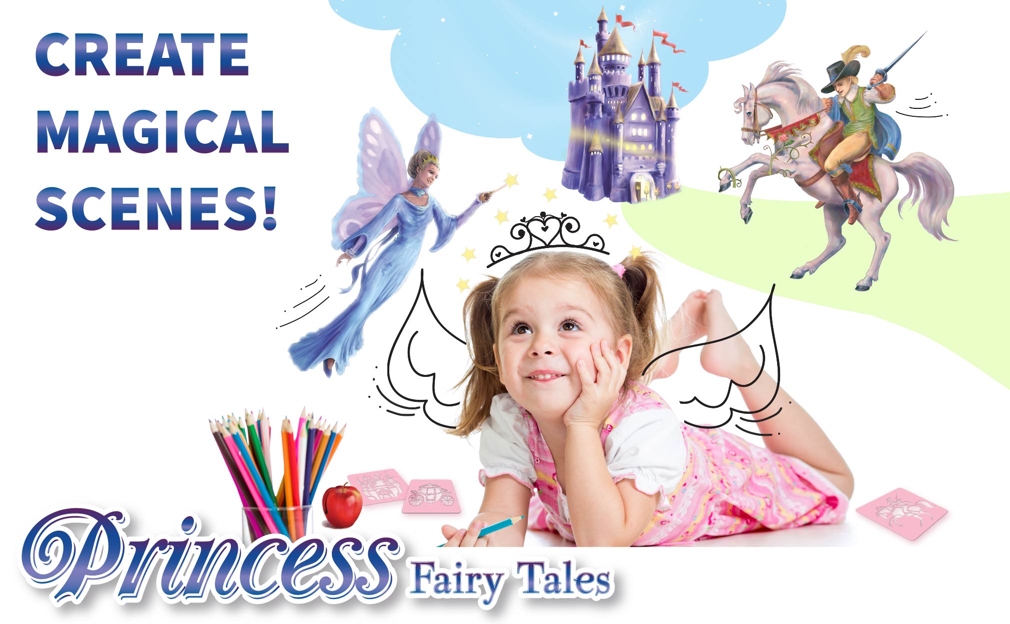 FAIRY TALE FAVORITES WITH 5 PROJECTS - Read 5 classic fairy tale stories: Cinderella, Sleeping Beauty, Snow White, The Frog and Prince, and Beauty and the Beast. Color along using the 5 princess stencils for kids. This kids storybook and drawing kit for kids contains everything you need to get started!