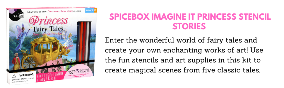 With the SpiceBox Imagine It Princess Stories, enter the wonderful world of fairy tales and create your own enchanting works of art! Use the fun princess stencils and art supplies in this kit to create magical scenes from 5 classic tales, Cinderella, Sleeping Beauty, Snow White, The Frog and Prince, and Beauty and the Beast. This drawing set for kids includes everything they need to get started with creating storybook artwork. These fairy tale toys make great birthday gifts for kids.