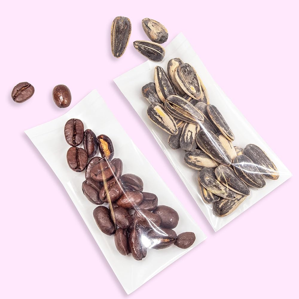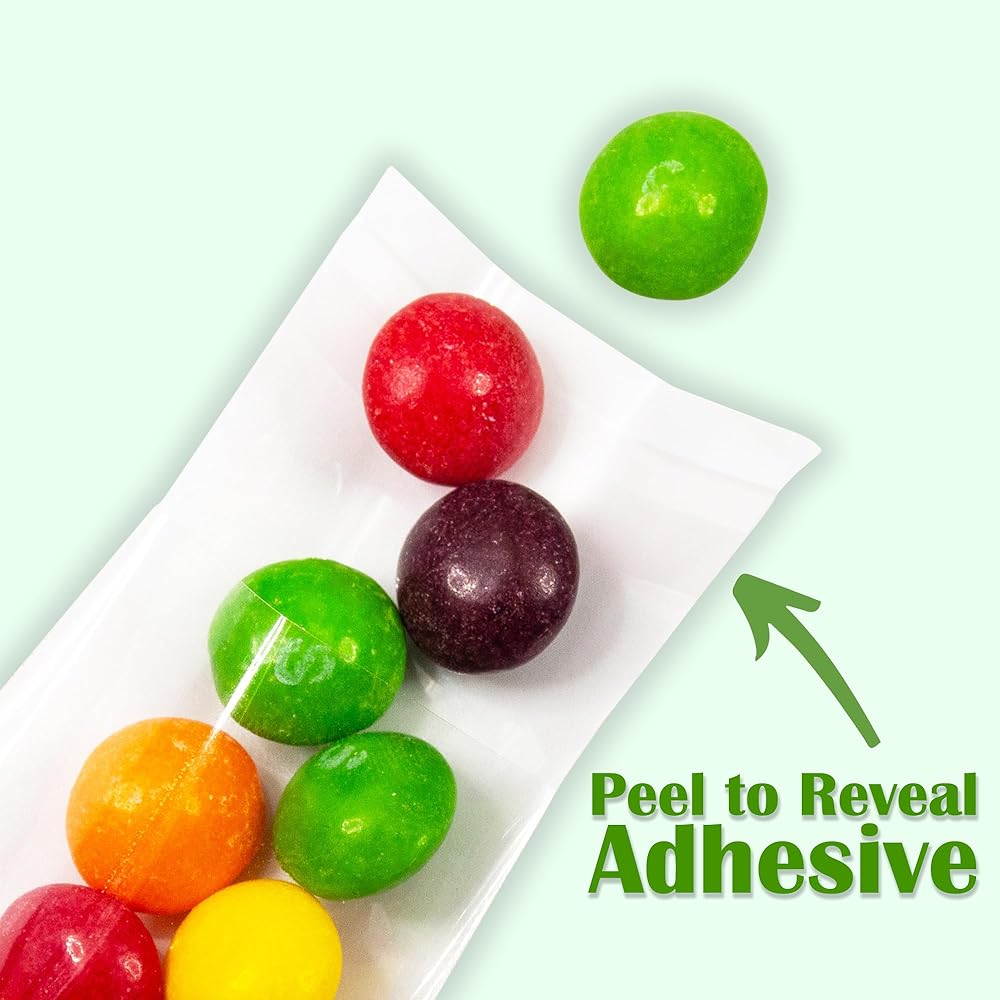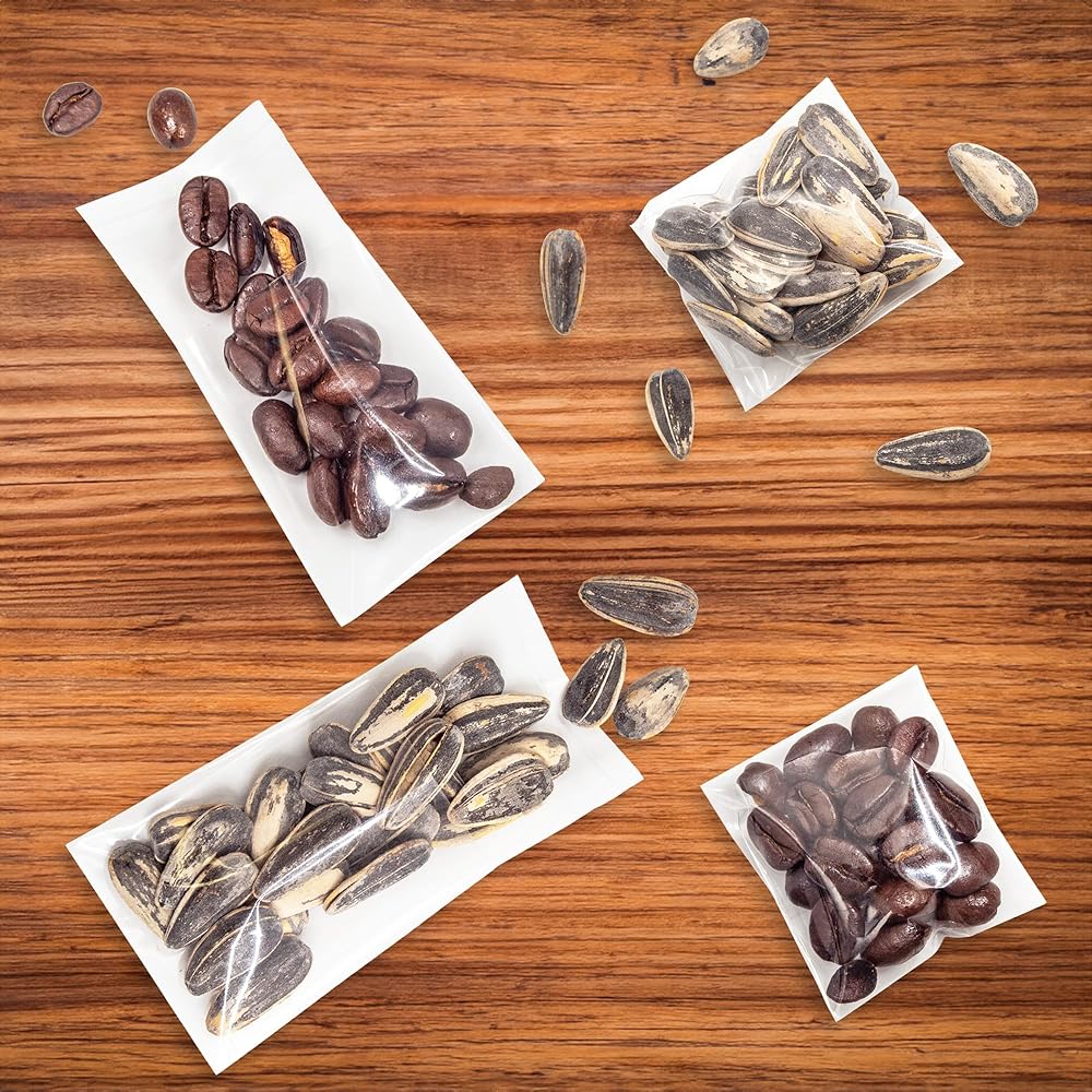 WIDENED ADHESIVE SEALING STRIP: Widened adhesive sticks to ensure a more tight seal, package better, save fresh longer, can package biscuits, candy, a variety of snack nuts, with resealable self sealing and no need twist ties.