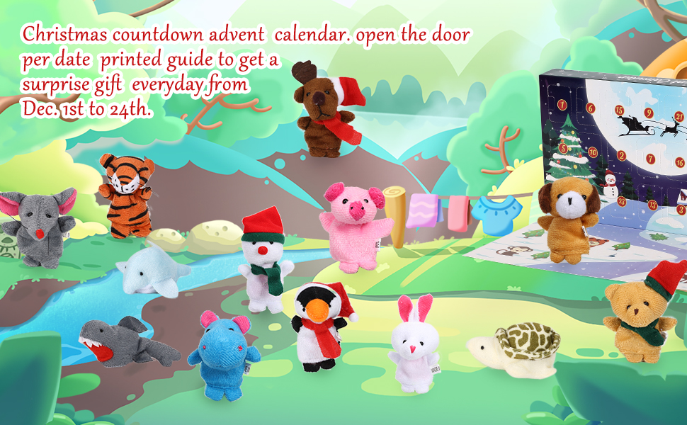 【SUPER VALUE PACK】Christmas countdown Advent Calendar includes 24 days Countdown with 13 Plush Animals finger puppets, 5 Christmas Characters, and 6 people family members. Let kids open one door a day according the printed date for 24 days to discover surprise everyday.