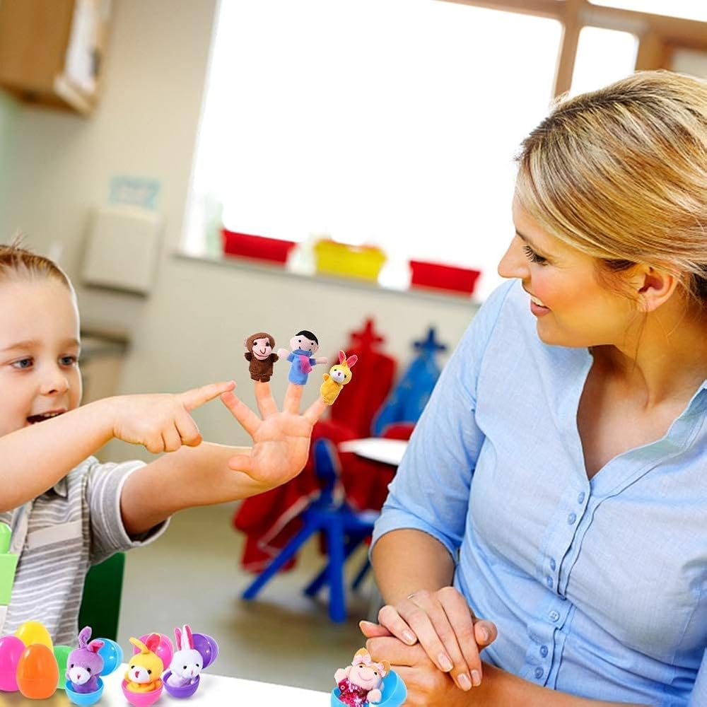 【24 FINGER PUPPETS】13 Plush Animals finger puppets, 5 Christmas Characters, and 6 people family members make playtime fun for kids. Each measures about 2.6 inches. They are cute and very portable. They make for an excellent small prize.