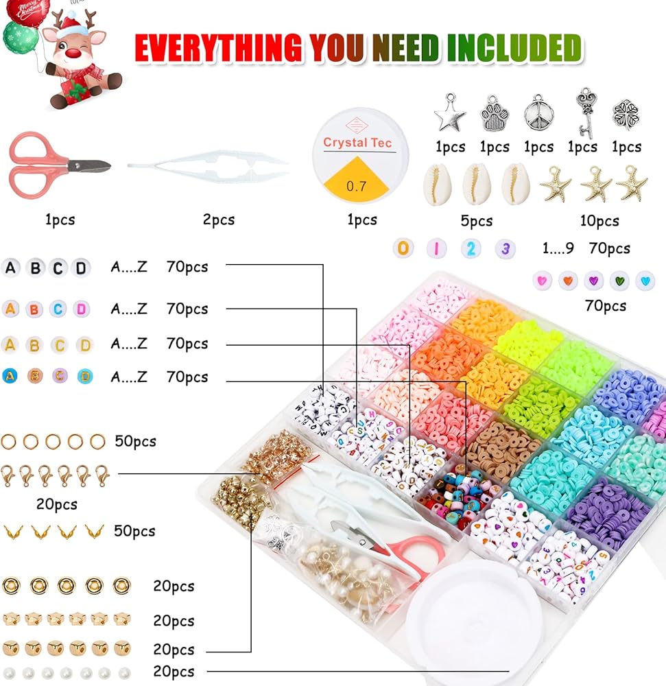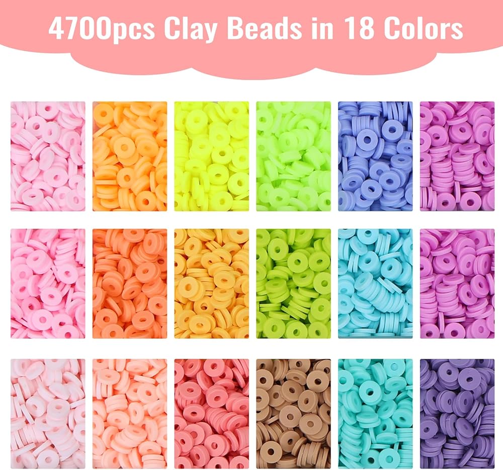 Super Value Set: This package offers a wide range of beads and accessories for your creative projects. It includes 18 colors of flat clay heishi beads, totaling 4700 pieces. In addition, you'll find an assortment of other beads such as letters beads, heart beads, colorful beads, round beads, flat round beads, square golden beads, pentagram beads, golden starfishes, golden shells, and silver pendants