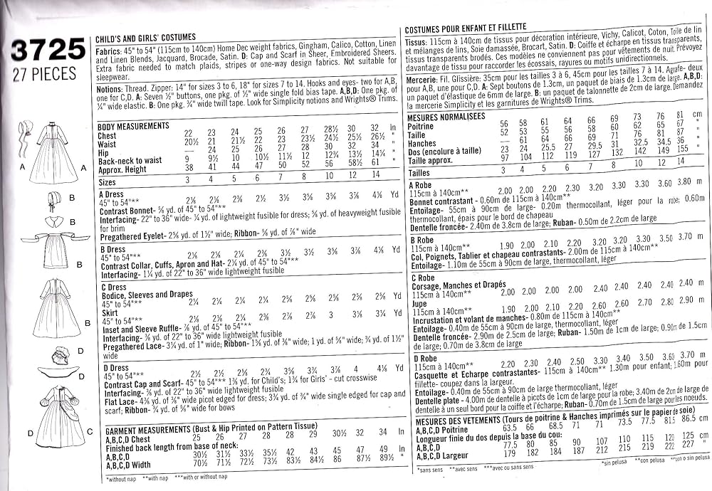 Whether you're preparing a Girls Halloween Costume, or need a Sewing Pattern for pretend play, these historical looks are just the thing! Including designs for cap and apron accessories, the sewing skill level is beginner to intermediate. This pattern includes a total of (4) different outfits. Prepared with English and Spanish instructions, the sizes enclosed are girl's 7-14.