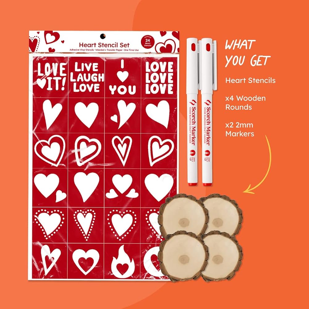 **WHAT'S INCLUDED?** - 1x Set of 24 Heart Stencils - 2x Scorch Marker 2mm Felt Tips - 4x Sourwood Slices (Blank Coasters) - Heat Gun is NOT Included*