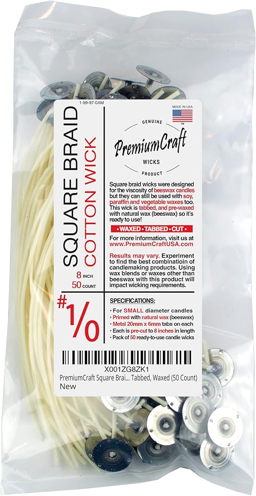 This PremiumCraft pre-tabbed, pre-waxed and pre-cut square braid wick lineup removes the hassle of preparing the wicks for use yourself. Enjoy the same high quality product as the raw, un-tabbed version without the extra step. Square braid wicks were originally designed for the viscosity of beeswax candles, however, they can still be used for soy and paraffin creations as well. Our primed, waxed and cut candle wicks are ready to use. They have been primed with a natural wax (beeswax), tabbed with a 20mm x 6mm metal sustainer and have been pre-cut to the length of 8 inches. Candle making is more art than science. Test burning candles using various wick sizes is recommended to determine the right size wick for your particular application. Experiment, it's part of the fun! For MEDIUM diameter candles. Follow instructions on the label prior to use. Total count per package is 50 pre-waxed, pre-tabbed, and pre-cut square braided, cotton candle wicks.
