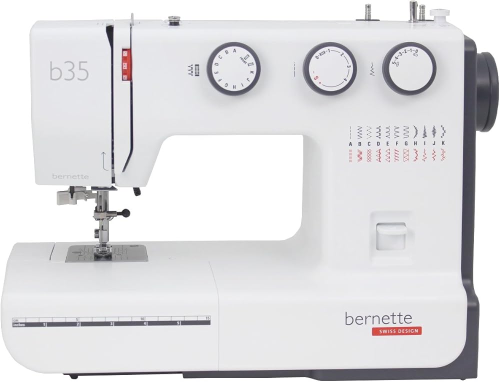 The inexpensive sewing machine for beginners which includes 23 stitches and 7 presser feet. Bundle Includes: Bernette 10 Piece Presser Foot Kit, 15 Class Plastic Bobbins-10pc, 2ea. Organ Universal Needles 10Pk. he bernette 35 is a mechanical sewing machine with no computerized controls. The width, length and pattern of stitches are easily set by turning the three knobs. Tension can be adjusted during sewing by using an easily accessible wheel. The bernette 35 has an automatic one step buttonhole function which is quick and easy to use. Two step presser foot lift Adjustable stitch length & width Automatic buttonhole Includes 7 presser feet Total of 23 utility and decorative stitches Automatic buttonhole allows you to sew professional buttonholes quickly and easily. With the bernette 35, it is quick and easy to sew buttonholes into your project. You don't have to lift the needle or change the settings on your machine. Your sewing machine will sew all four steps of the buttonhole automatically. In addition to the one step buttonhole function and the 23 utility and decorative stitches, the bernette 35 also has a manual needle threader and a manual thread cutter, making your sewing faster and more efficient. The accessory box of your bernette 35 provides ample storage space for sewing utensils. With your bernette 35 you get seven presser feet and a stable presser foot shank. You can select the appropriate presser foot for whatever you want to sew. Features: Stitch Width - 5mm Hook system - Front loading Buttonhole - 1-step Utility Stitches - 14 Patterns - 23 Free arm - 170 mm Sewing speed - 860 stitches/minute Contents: Bobbins (4x) Seam ripper (buttonhole opener) Screwdriver (large) Screwdriver (small) Needle assortment Zigzag foot Hemmer foot Zipper foot Satin stitch foot Button-sew-on foot Blind stitch foot Buttonhole foot with slide Foot control