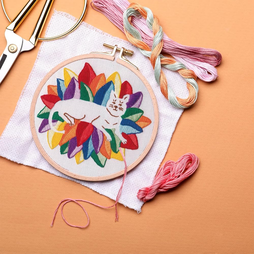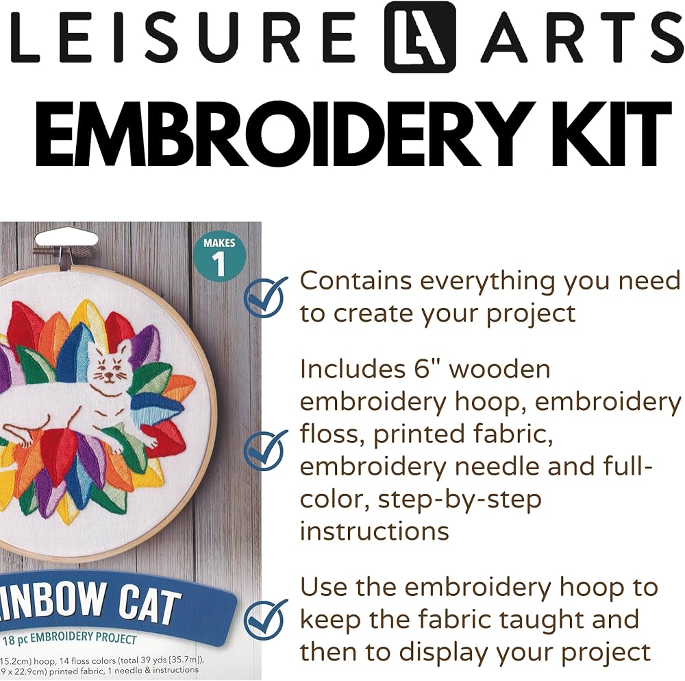 Leisure Arts Kit Embroidery 6" Rainbow Cat- Printed embroidery design for easy completion. Can be completed and used as a wall decoration for your living room, bedroom, office and anywhere else you want a little flowery cheer. It can be a beautiful present for your wife, kids or friends to wish them happy birthday. This embroidery kit with pattern and instructions is suitable for any skill level, even beginners. Pre-printed fabric and instructions make it perfect for anyone to learn embroidery. Easy for beginners, adults or kids and printed patterns easy to follow. Also great for teaching embroidery and the steps and stitches to complete a project. What's more exciting than passing on and sharing your craft with others? Includes 6" wooden embroidery hoop, embroidery floss, printed organza fabric, embroidery needle and full-color, step-by-step instructions. Use the embroidery hoop to keep the fabric taught and then to display your project. Makes one design. Colors and contents may vary.