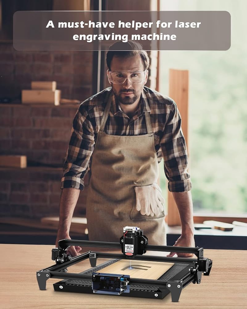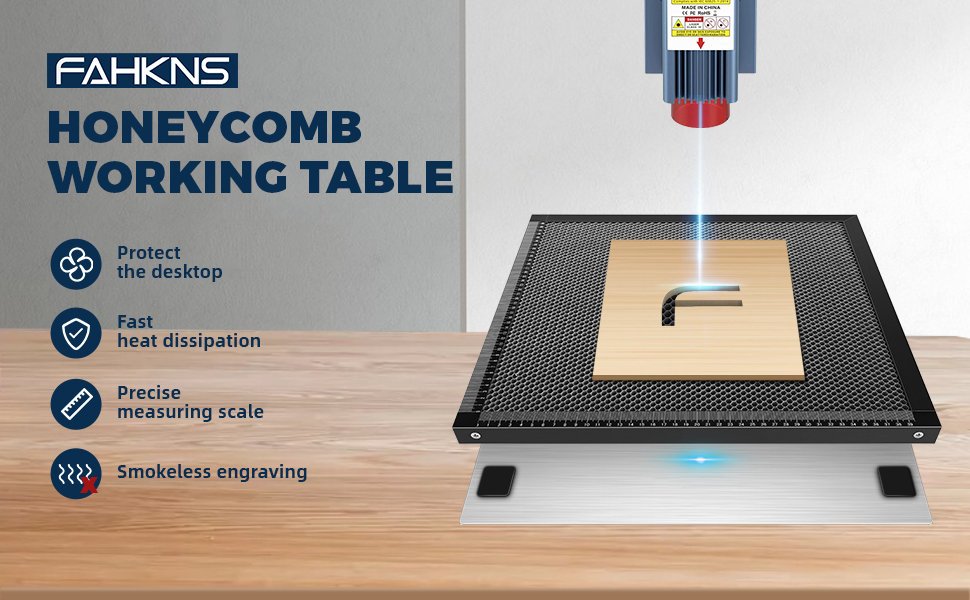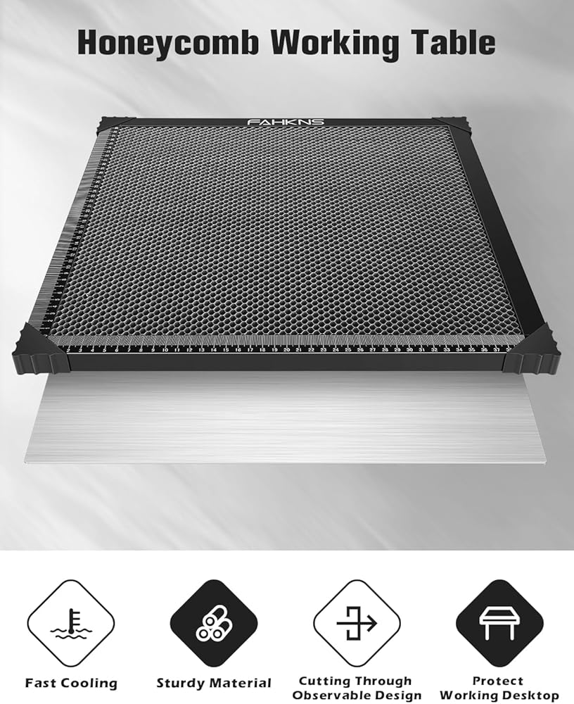 DOUBLE PROTECTION--Honeycomb working table + aluminum plate. Not only can the honeycomb enhance the ability to handle smoke and debris from laser engraving, it also keeps the table clean and tidy. The aluminum plate paired with the honeycomb laser bed prevents the laser from burning the table during engraving.