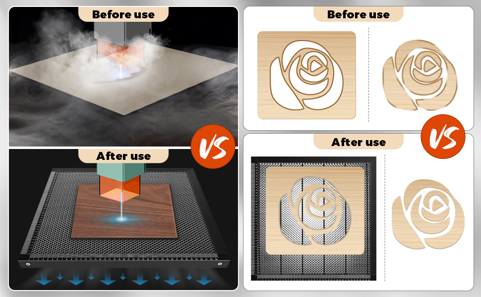 BETTER ENGRAVING EXPERIENCE--No smoke, slightly burned, smooth edges. With this honeycomb working table, you can get: Fast heat dissipation, High quality materials,Engraving laser visible design. Protect your working table and your engraved artwork with it now!