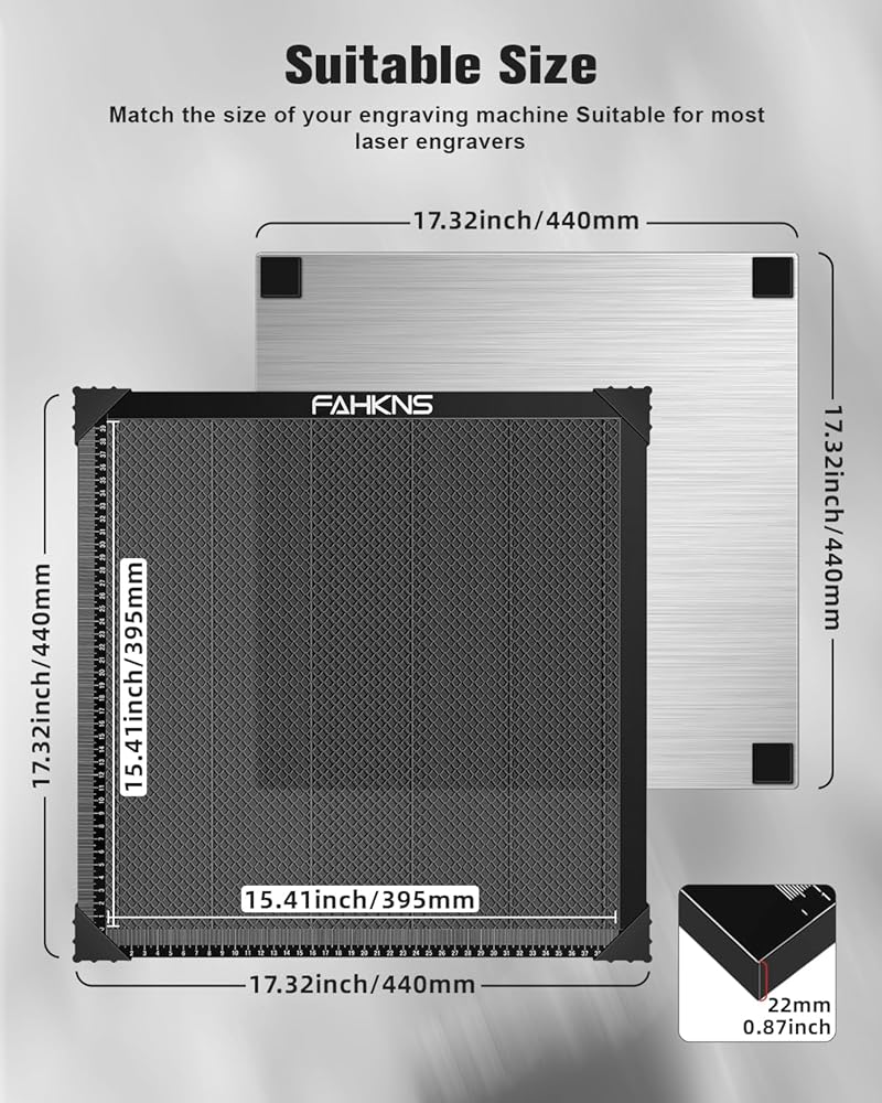 ALWAYS THE SUITABLE SIZE--FAHKNS honeycomb laser beds are available in a variety of sizes. Size of this one (LxWxH): 440x440x22mm(17.32x17.32x0.87inches), actual working area is 395 x 395 x 22mm (15.41 x 15.41 x 0.87 inches). You will find the right one for your laser engraving machine. Our honeycomb work table is made of durable metal and processed with high precision, it's sturdy, durable, stable, rust-proof.