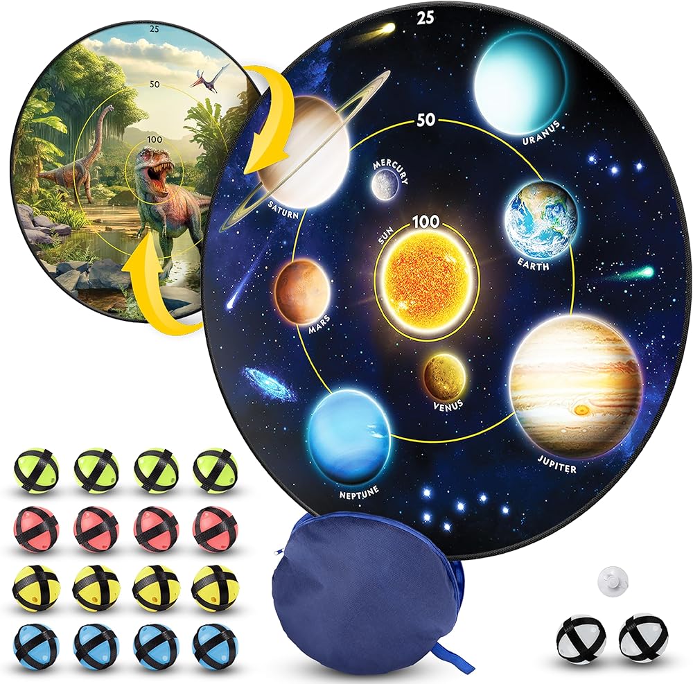SAFE DART FUN FOR KIDS - With its glow-in-the-dark sticky balls and large, reversible dartboard, kids can experience the fun of darts safely! The board can hang anywhere and has both space and dinosaur themes kids can enjoy.
