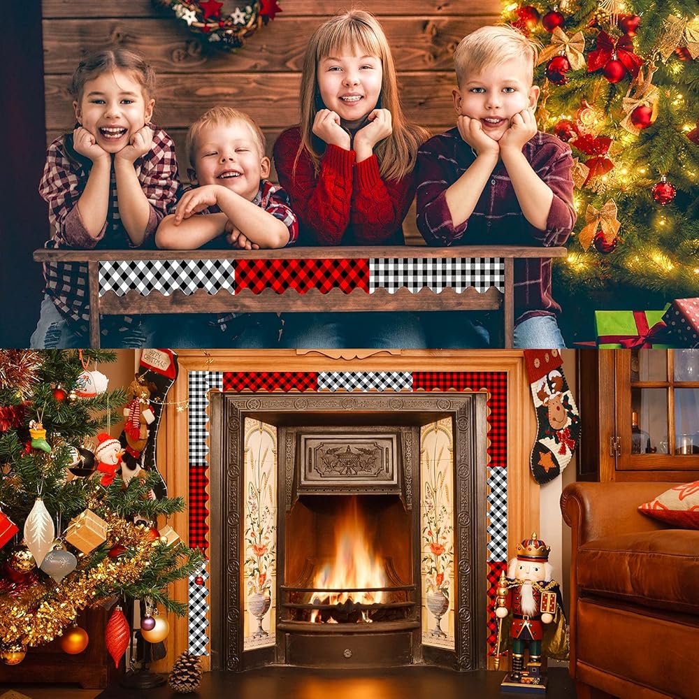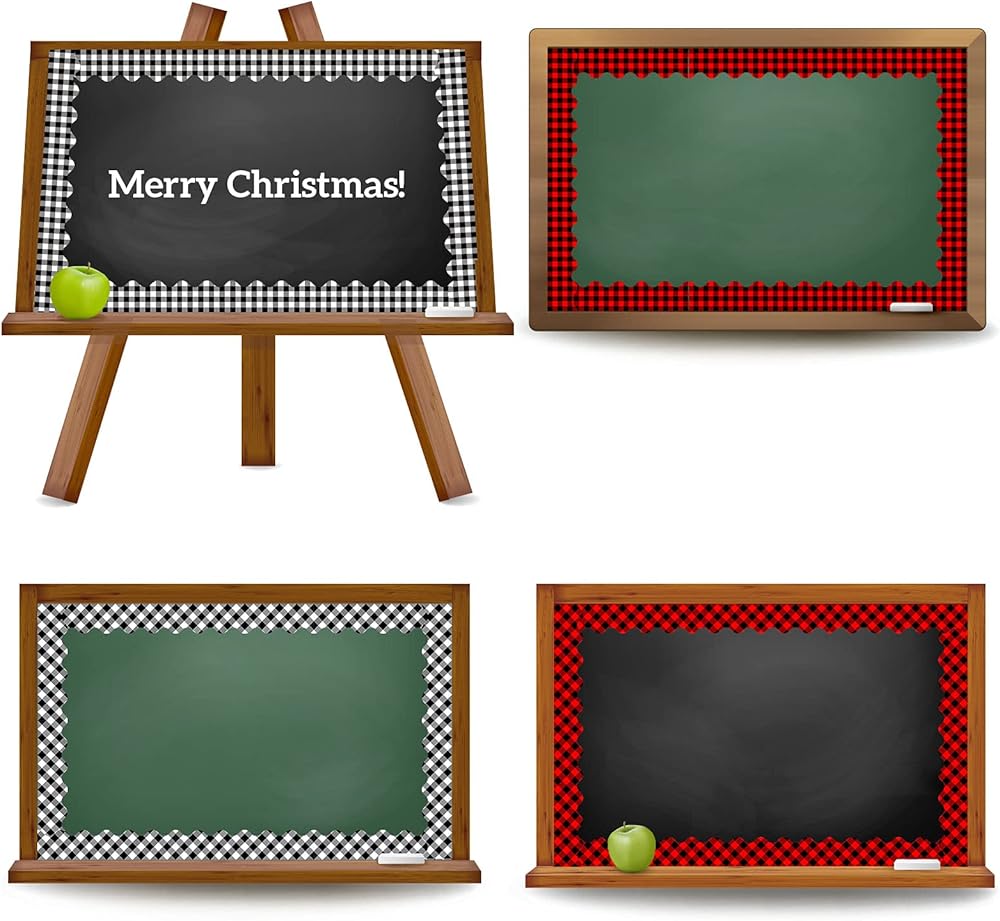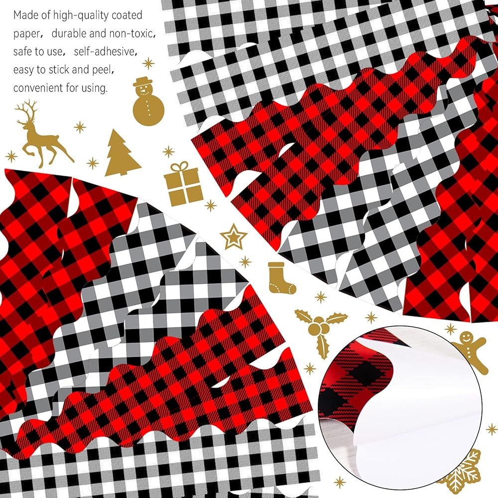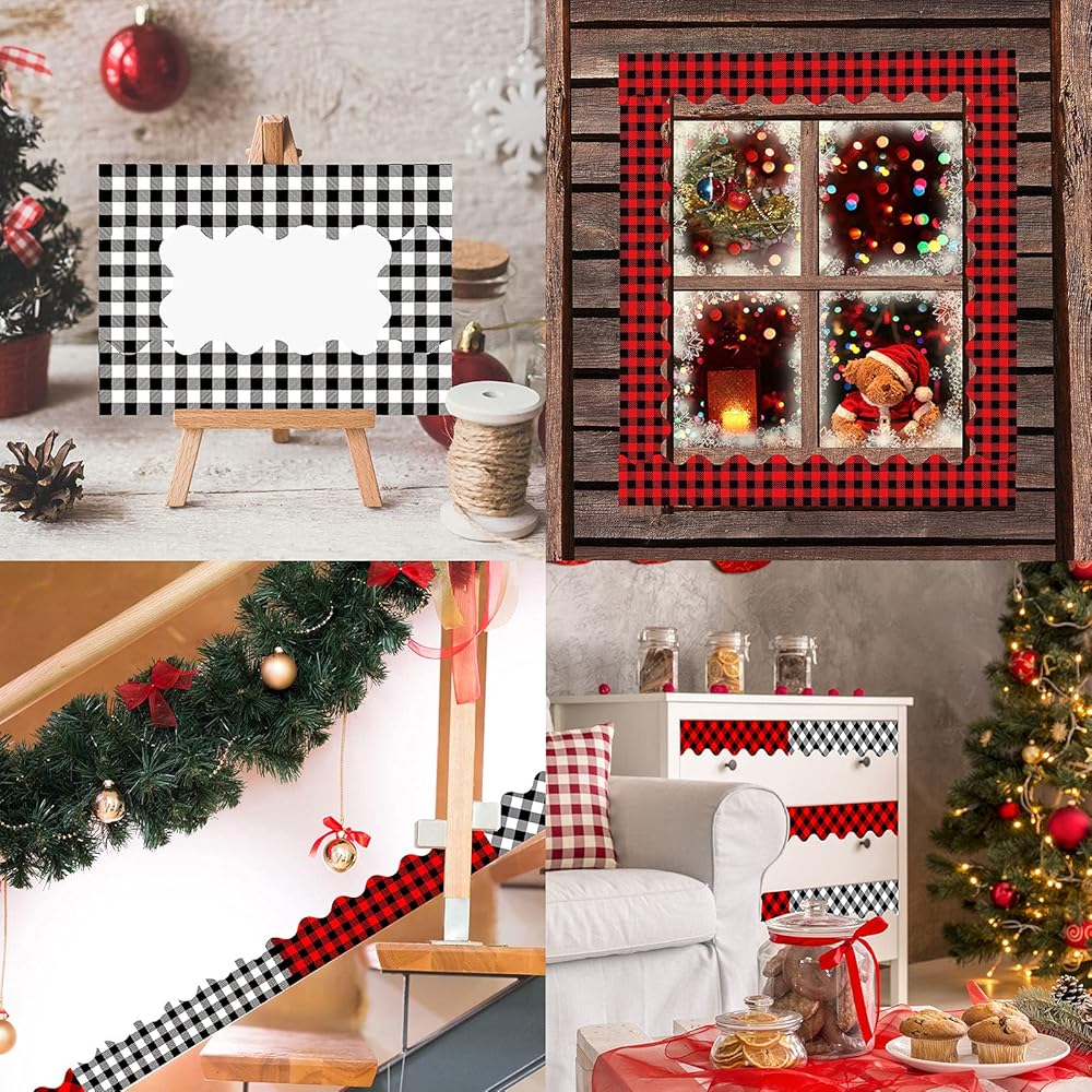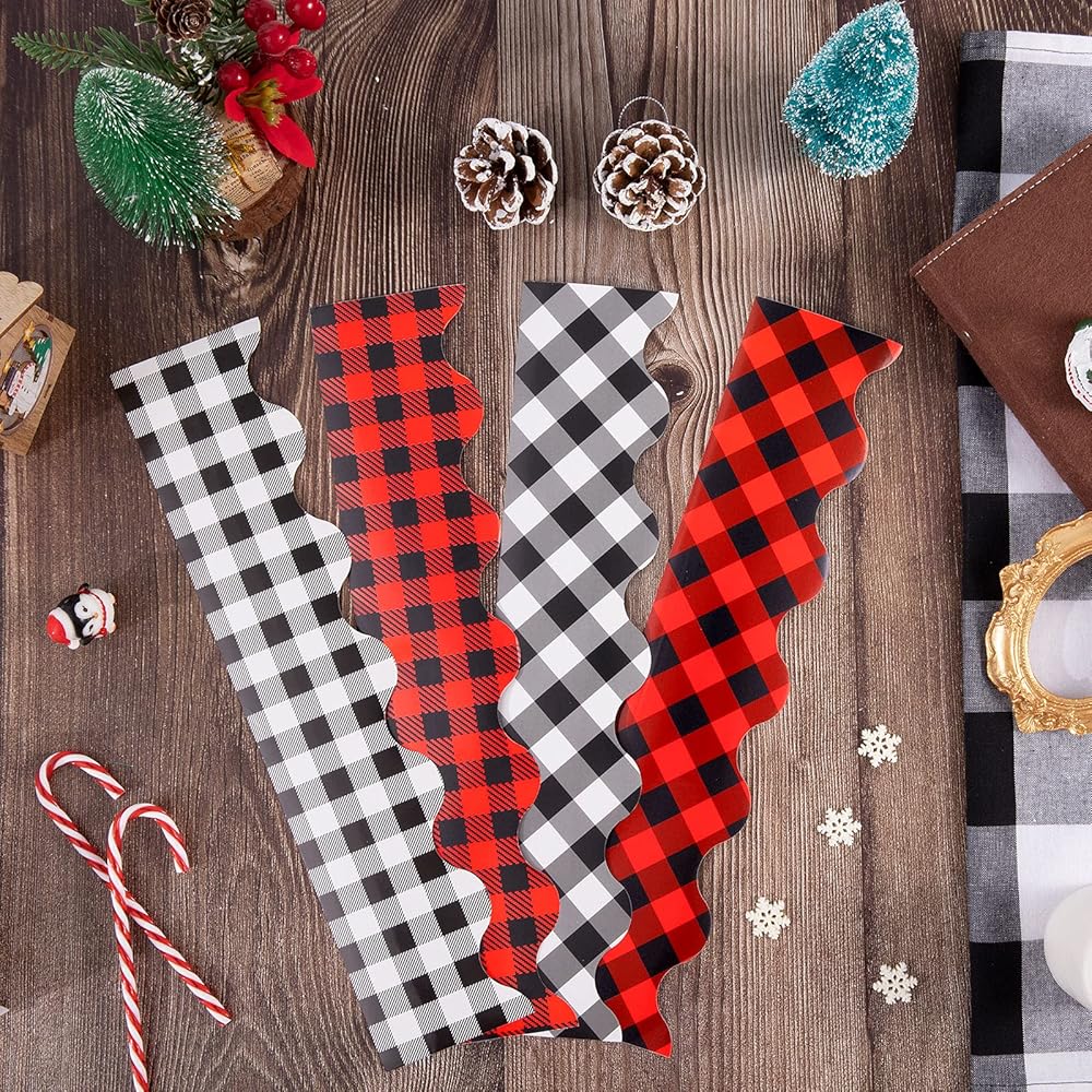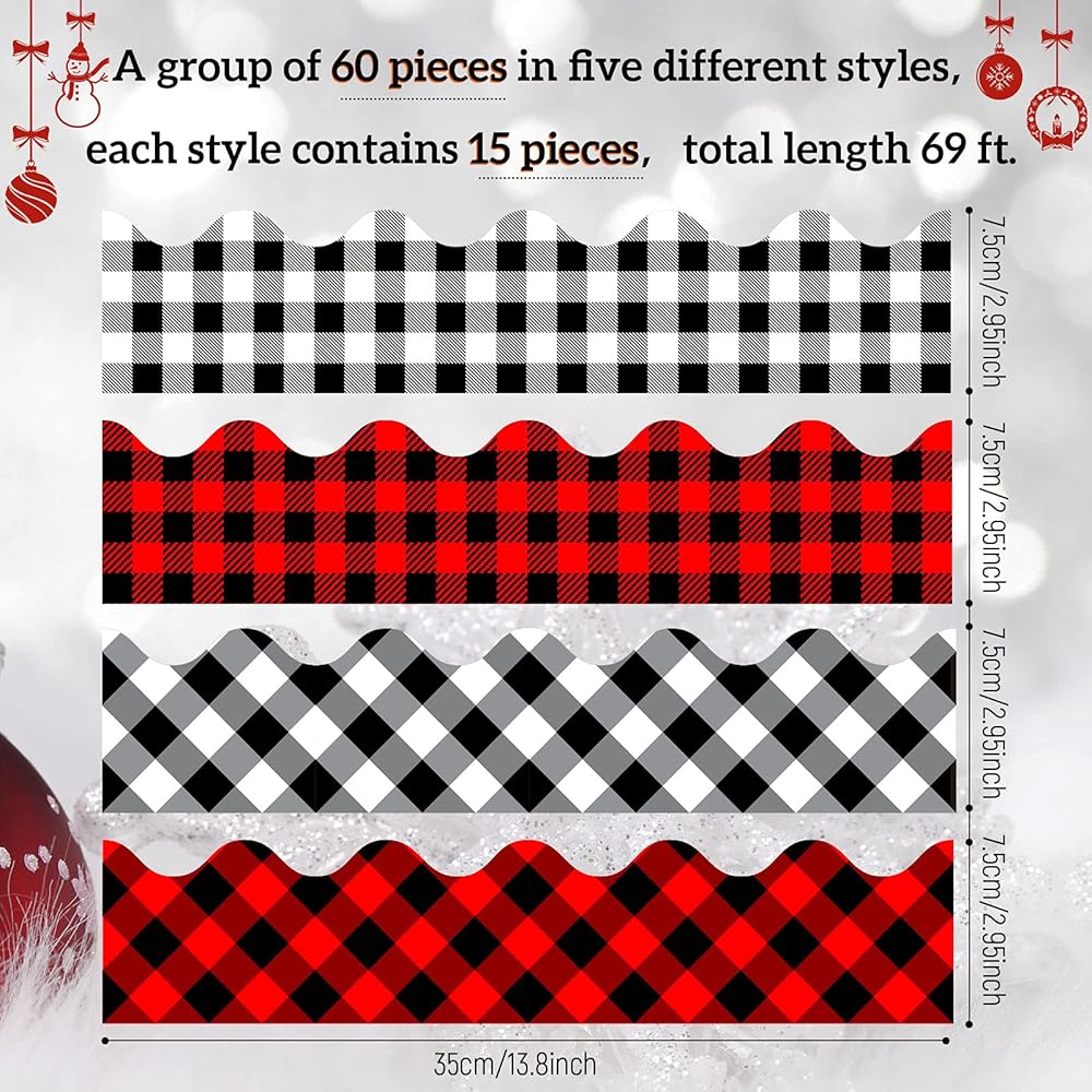Whaline 69Ft Christmas Plaid Bulletin Border Stickers 60Pcs 4 Design Self-Adhesive Blackboard Border Sticker White Red Black Buffalo Plaid Border Trim for Classroom Chalkboard School Office Wall Decor