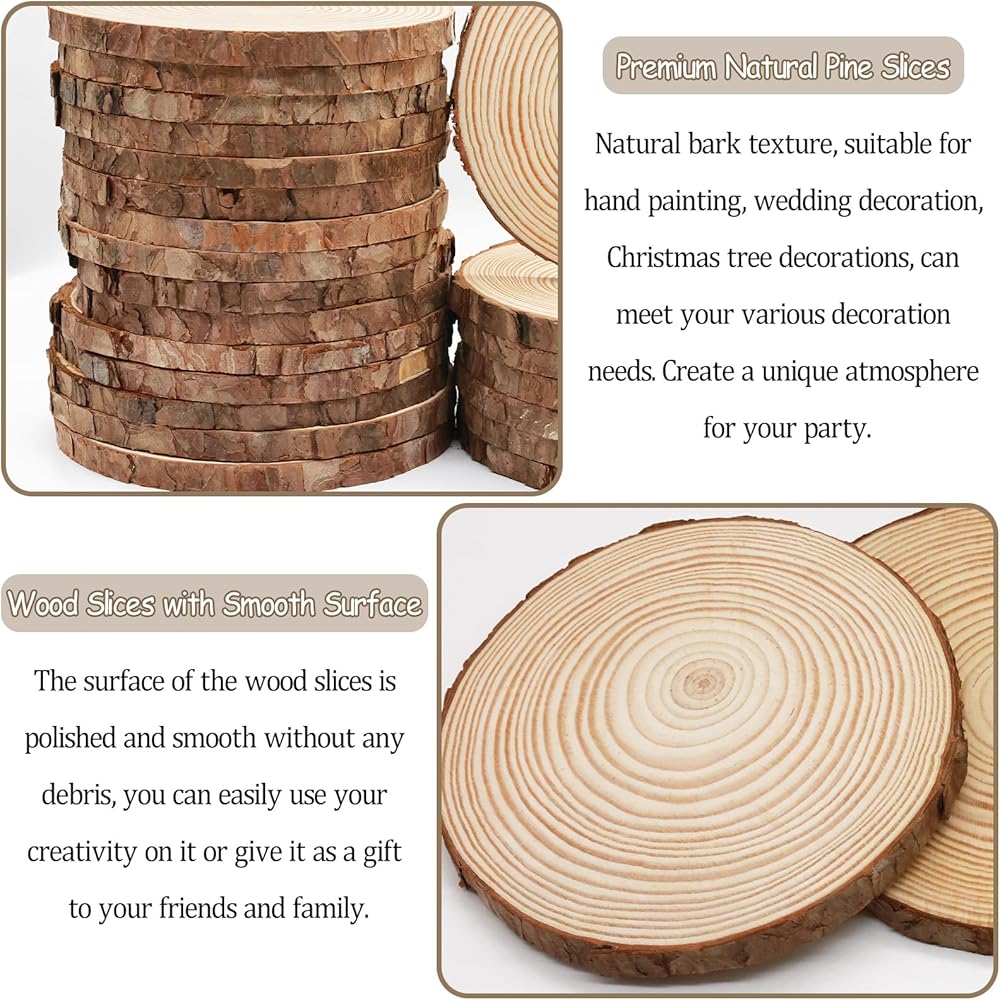 Premium Material: Our wood slices craft are made of nature pine with bark, The size of each piece is not exactly the same, unique rustic wood pieces decorated.