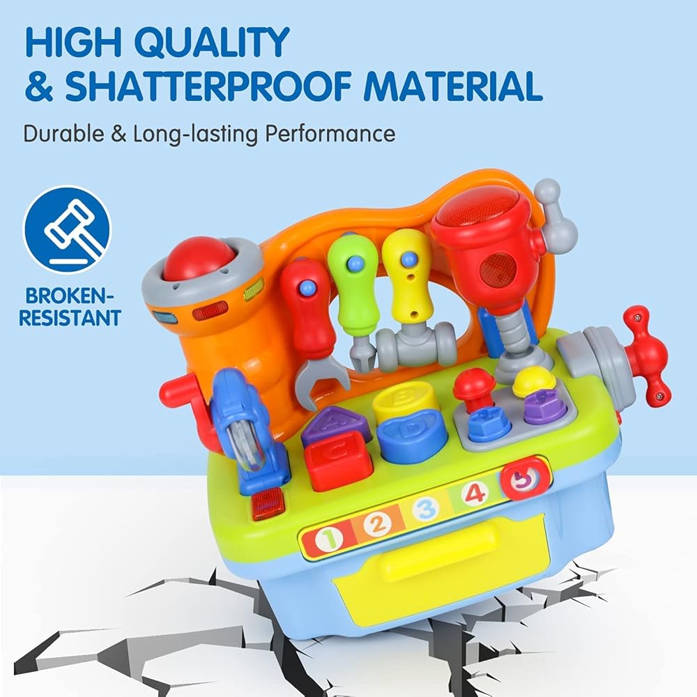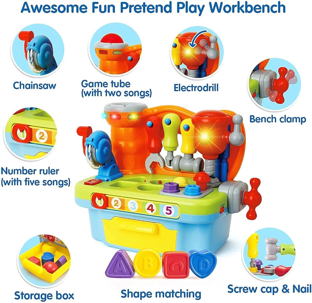 WHO SAYS LEARNING CAN'T BE FUN? This toy workbench not only helps develop essential skills like hand-eye coordination and problem-solving, but it also sings catchy songs and makes fun sound effects to keep your child entertained and engaged.