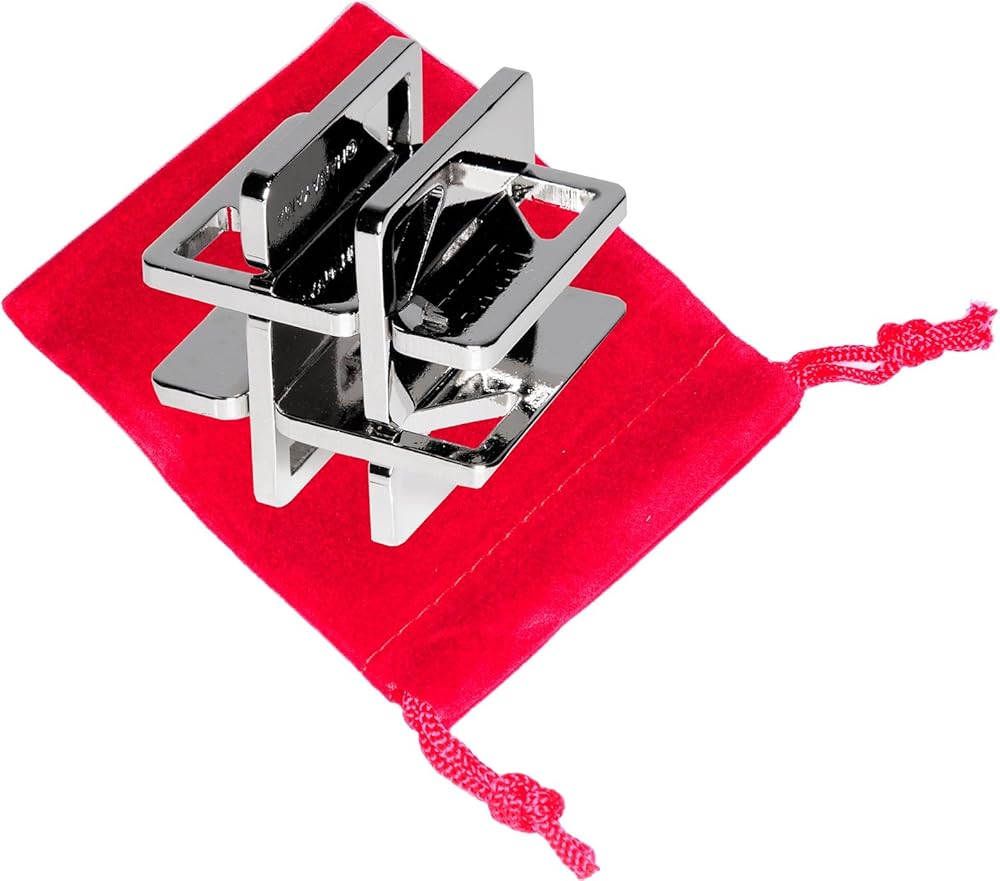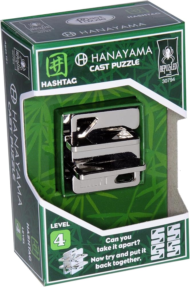 HASHTAG (AKA SHIFT) Cast Metal Puzzle from Hanayama Puzzles of Japan is both a delightful and tricky brain teaser puzzle. It consists of a "3D Hashtag-Shaped" cast metal body body with four interlocking pieces. The object is to separate the four pieces. The second puzzle is to re-assemble the four flat pieces back together. Measures approximately 1.4 inches in three dimensions when assembled. This is a really fascinating disentanglement brainteaser. HASHTAG Hanayama Puzzle is a NEW 2017 Release. Also known as "SHIFT" Hanayama. Recommended for ages 13 to 105 years. NO force is used to solve. Forcing pieces may damage the puzzle !! Includes Red Velveteen Drawstring storage pouch. Measures approximately 3 x 4 inches laying flat. Rated by the manufacturer as a level 4 difficulty (on a scale of 1 to 6 where 6 is the most challenging.) Difficulty level shown on the packaging. Your own experience could vary substantially. HASHTAG is part of a series of 60 plus very interesting and mentally provocative metal brain teasers from the Hanayama Puzzle Company. Some serious puzzlers refer to these as "disentanglement-style puzzles" as they involve taking something apart and then re-assembling. Re-assembly can also be a puzzle and may be equally as tricky.Reminder. NO FORCE is ever required to solve the puzzle. Just a series of clever moves.
