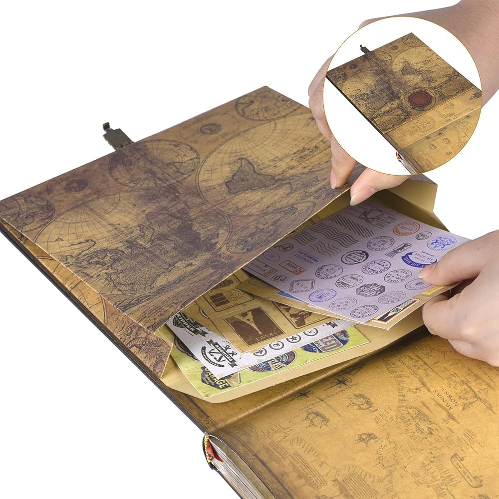 💏【Generous Size and Contents】The scrapbook measures 10.28 x 8.16 x 0.92 inches and includes 90 sheets/180 pages, accompanied by a gift box, stickers, and a practical craft paper bag on the back for storing stamps and travel tickets.