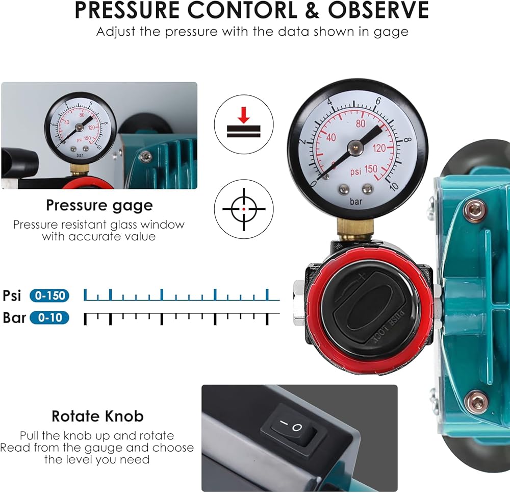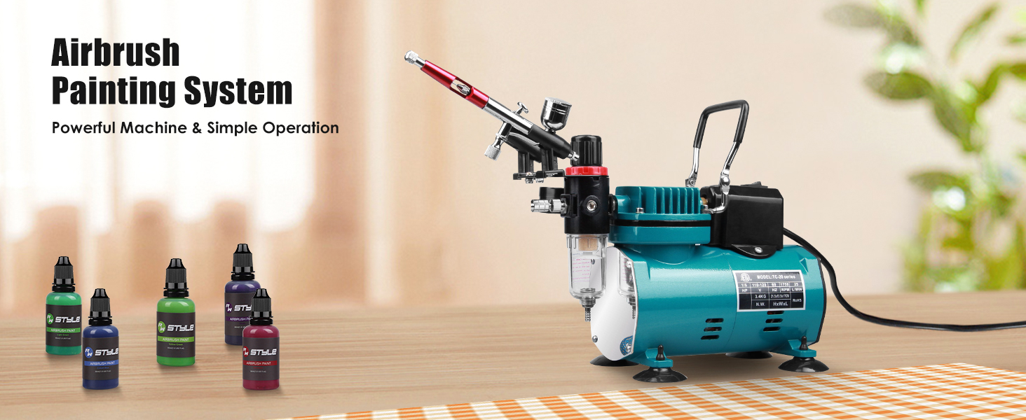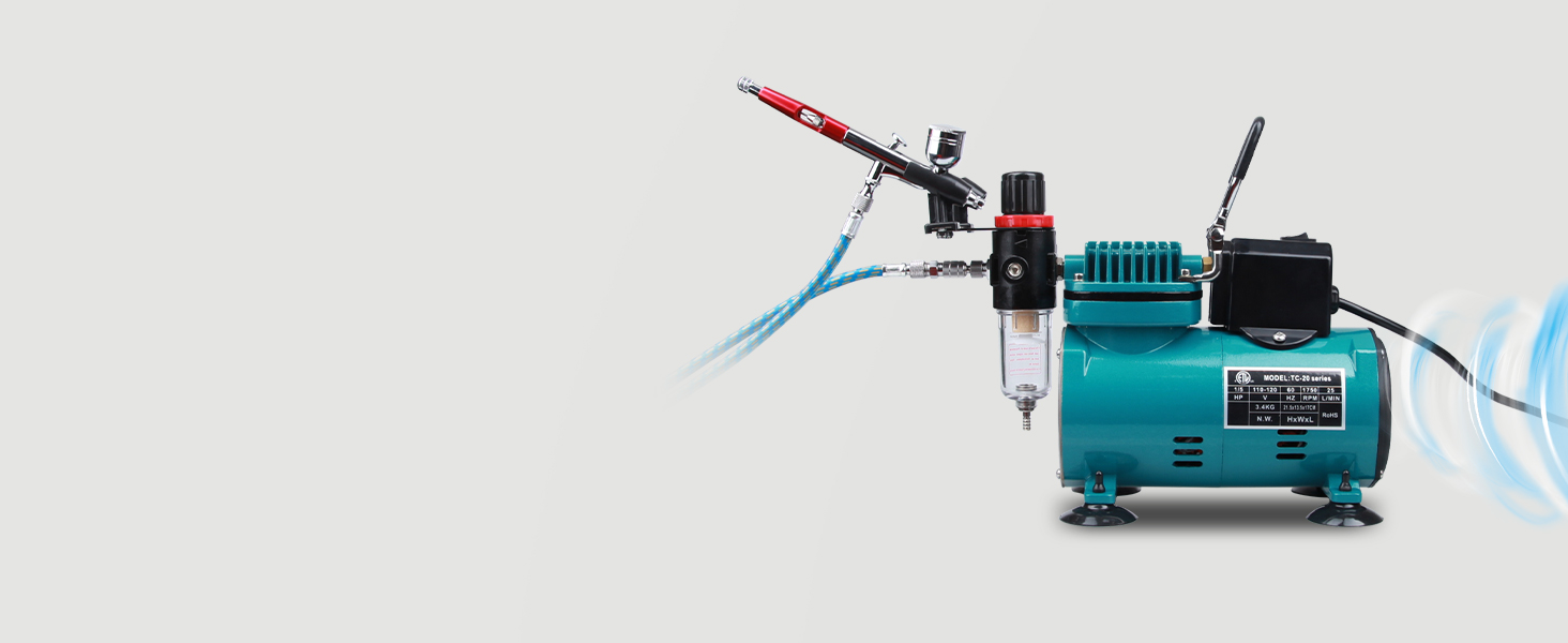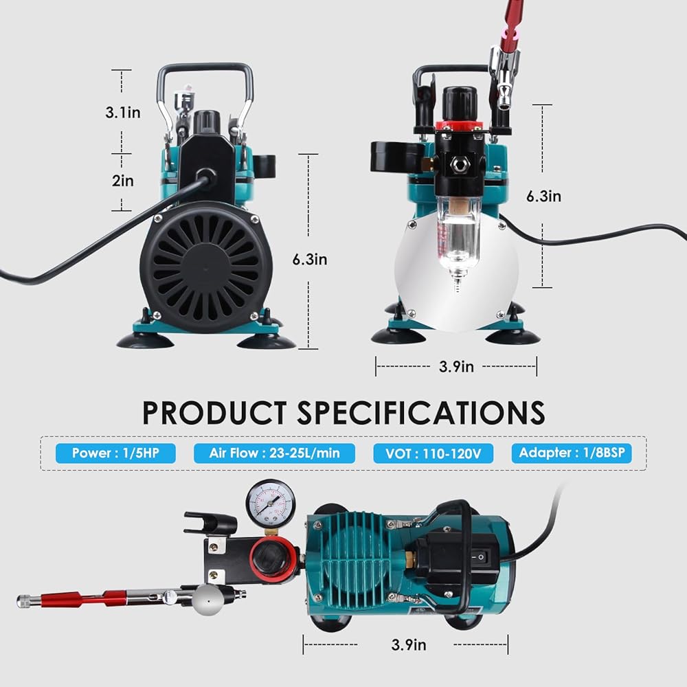 Rhinowisdom Airbrush Superior Performance Powerful 1/5 Hp Single-Piston Compressor with Two Cooling Fans That Allow It To Run Much Cooler For A Longer Continuous Running Time without Overheating. Includes Airbrush Holder.