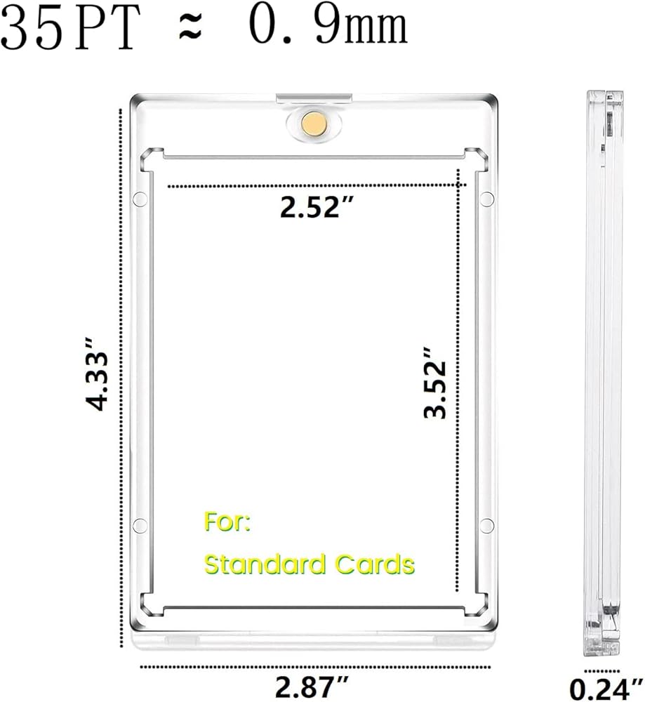 【Package and Product Size】Package includes 24ct magnetic card holders(55pt) .Inner dimension is 3.52 × 2.52 in, Outer dimension is 4.33 × 2.87 in, the thickness is 55 point. Sized to fit standard size ( 2.5" x 3.5" ).
