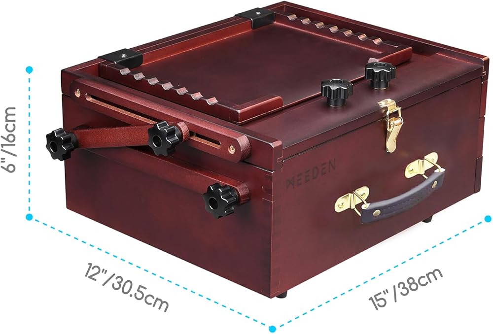 Infinite Range of Angles - Thanks to the hinged adjustment arm the lid can be held at any painting angle, and would even go completely flat for watercolor painting. The star knobs on the arm make the adjustments super easy.