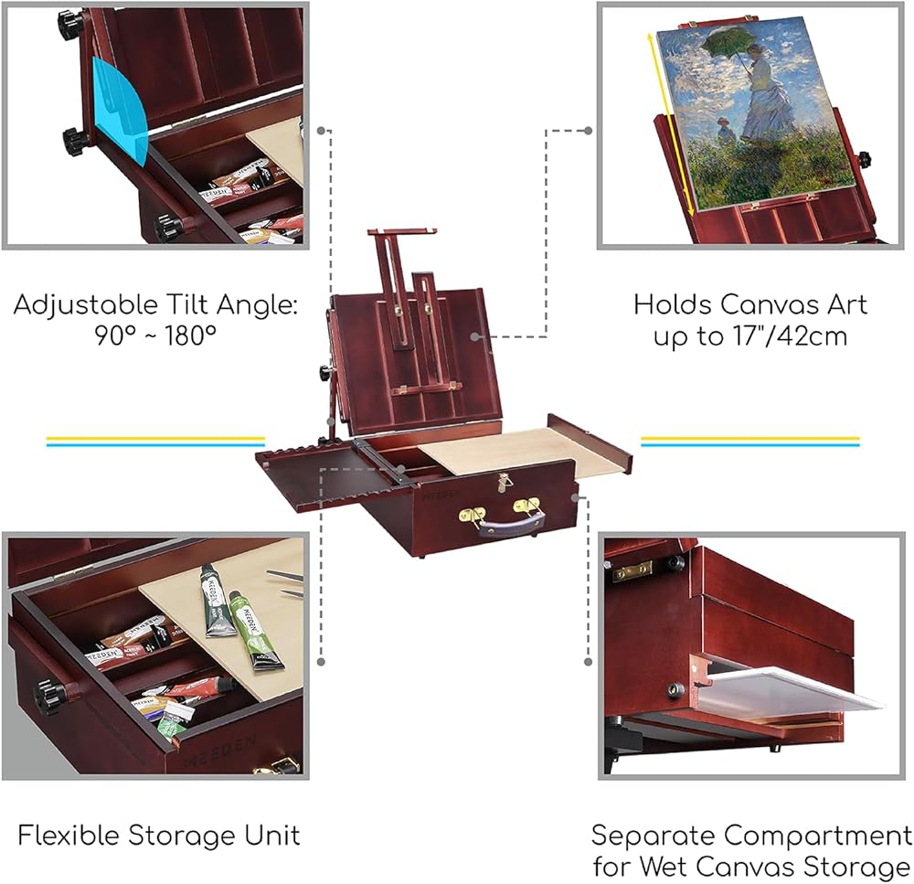 Transport Your Wet Paintings with Ease - The bottom of tabletop easels contains an adjustable wet panel storage area which allows you to carry 3-4PCS wet panels of any size from 8" x 10" to 9" x 12" during travel. This pochade leaves you with no need for a wet panel carrier as the panels can be stored conveniently and securely behind a sliding magnetic door. This babe's convenience and flexibility will leave your fellow Plein air painters impressed and green with envy.