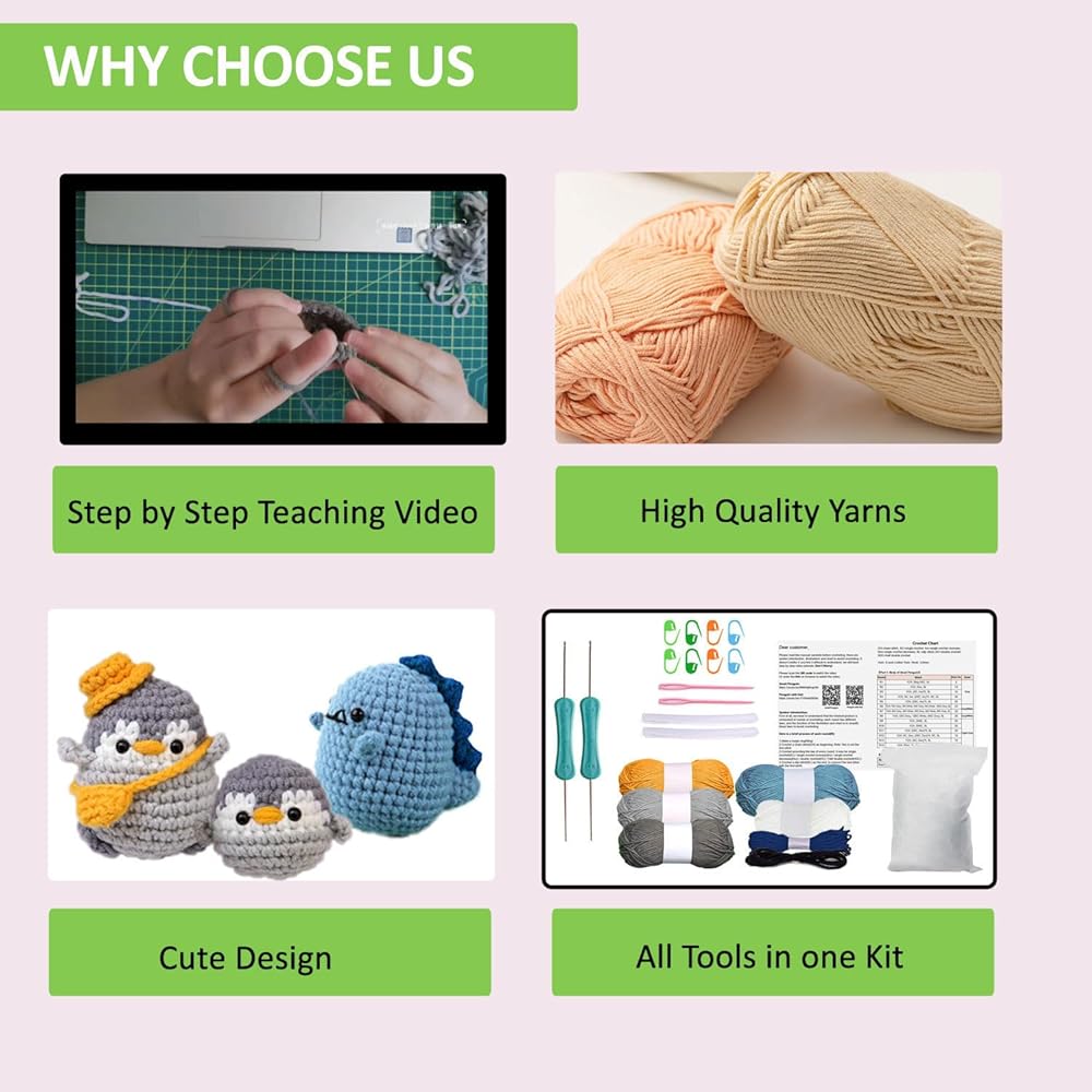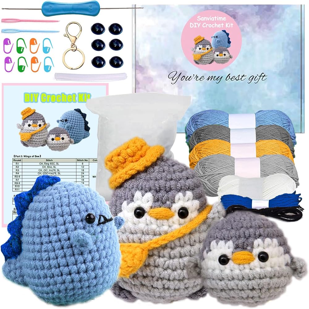 Sanviatime Crochet Kit for Beginners - Dinosaur and 2Pcs Penguins Animal Knitting Sets, Learn to Crochet Kits for Adults and Kids, Crochet Starter Kit with Step-by-Step Video Tutorials