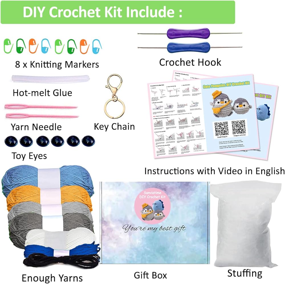 🐝Crochet Starter Kit: This beginner crochet kit comes with a GIFT BOX, includes everything you need to start: 4 different colored yarns, 1 crochet hook(random color), 1 stuffing, 2 plastic eyes, 4 knitting markers(random color), 1 key chain, 1 yarn needle(random color), 1 instruction.