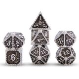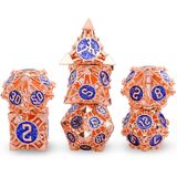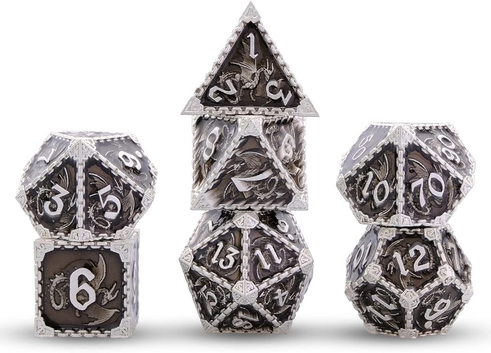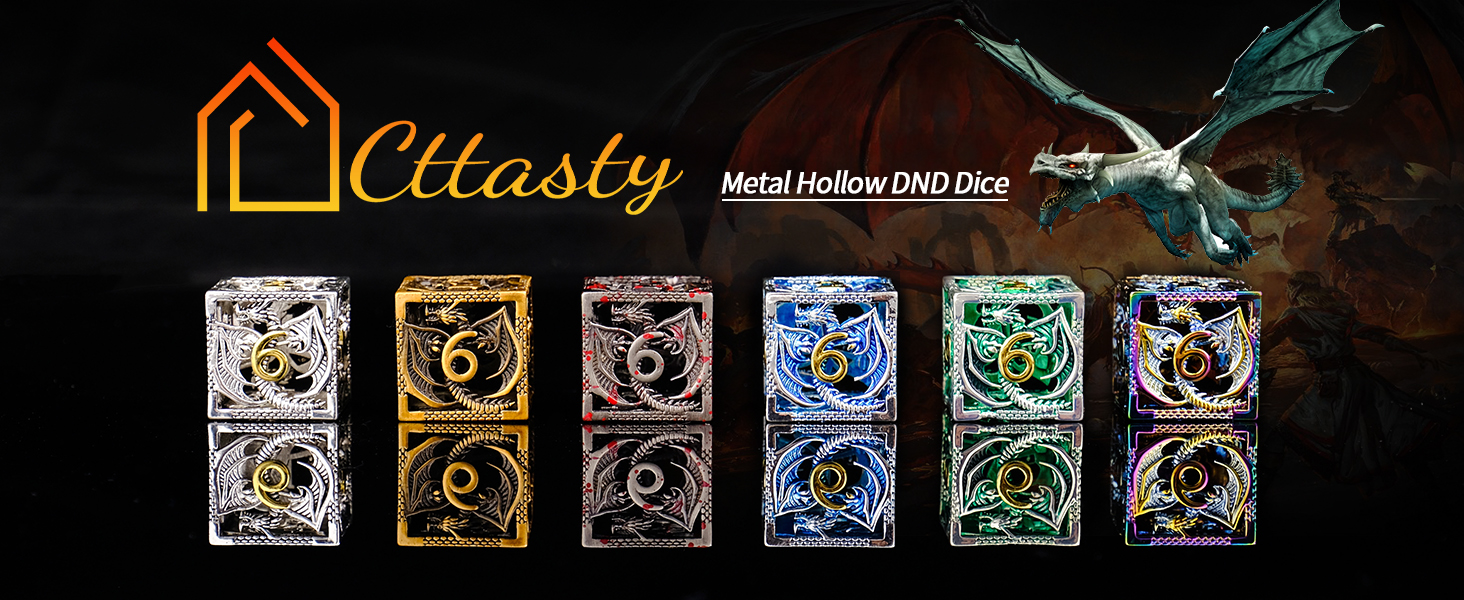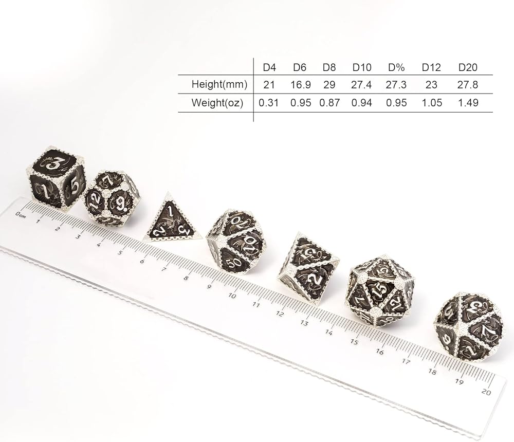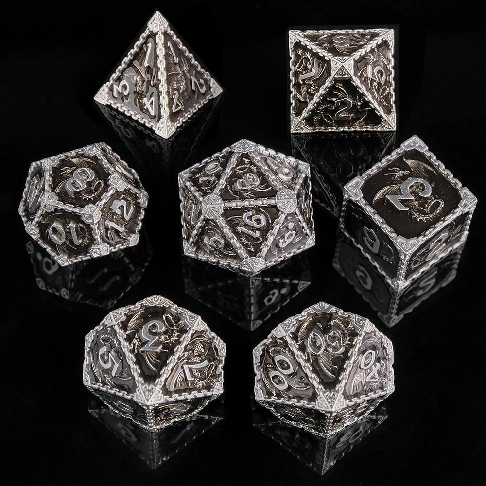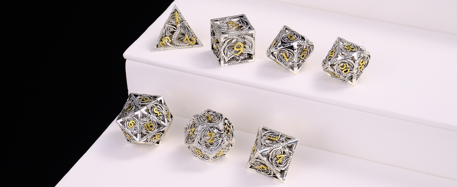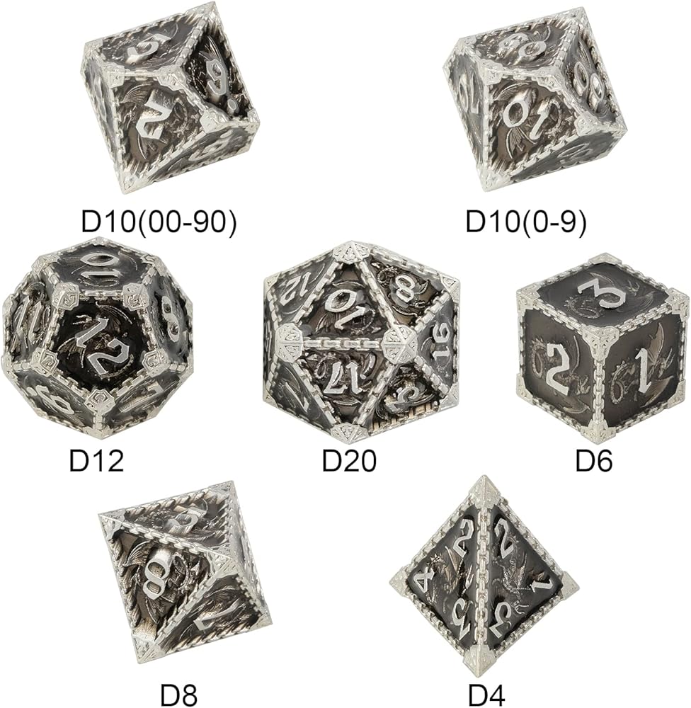 Metal hollow DND Dice Set: The intricately patterns are elegant yet solemn carefully carved and polished on each surface so they are vivid and smooth. They patterns are set off with different colors then covered with transparent coating made the color stays long and bright