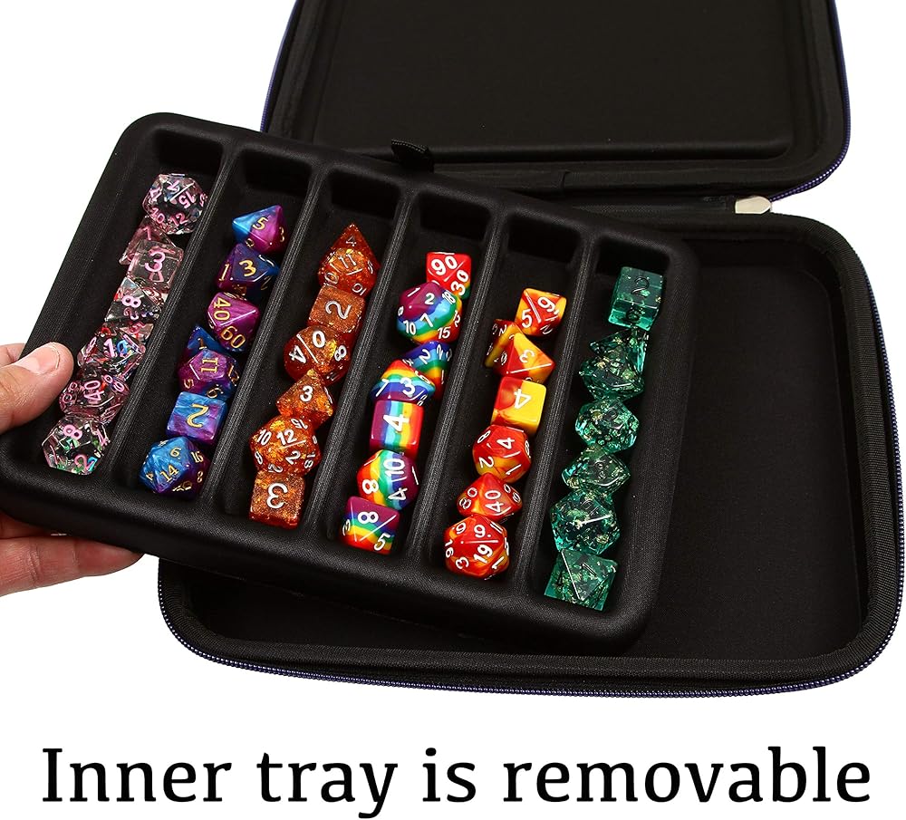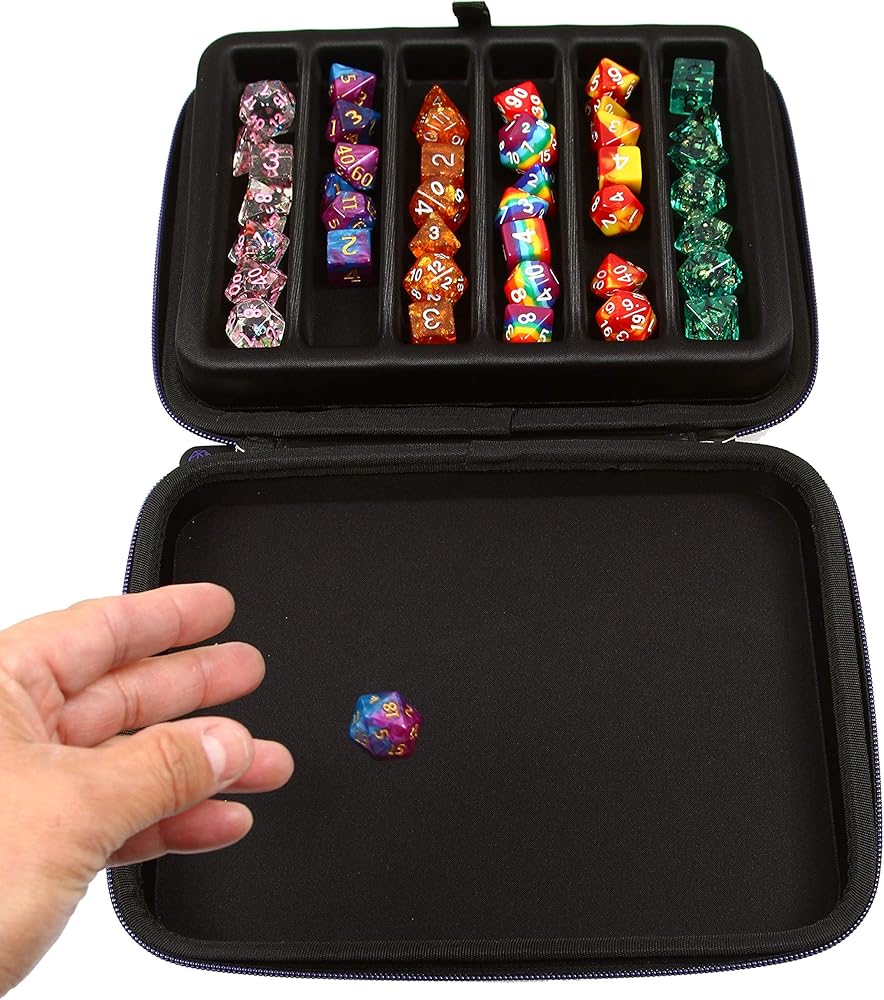 VERSITILE: Store and display up to 6 sets of standard polyhedral dice. Slotted dice tray is removable leaving the bottom section of the case usable as a dice tray