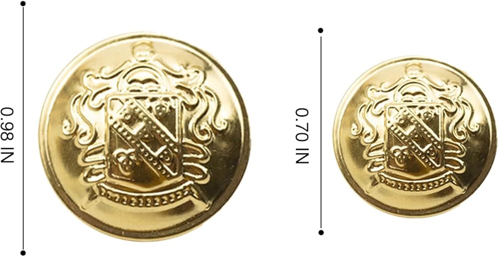 What will you get: 14 Pcs gold metal blazer button, 8 buttons sized 18mm (about 0.7 inch), 6 buttons sized 25mm (about 0.9 inch).