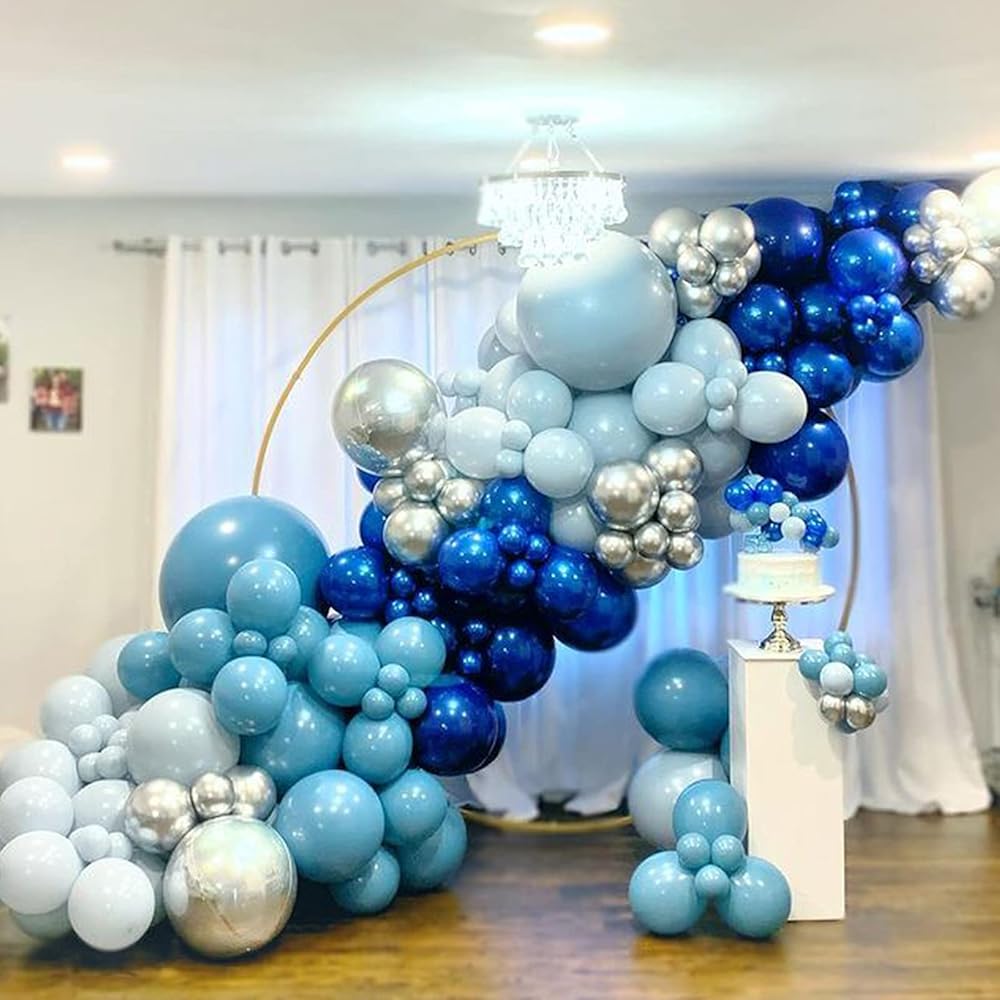 PACKAGE SPECIFICATION: Different size macaron balloons including:10in,5in,18in,three different blue balloons, dark blue macaron balloons, light blue macaron balloons, metal chrome blue balloons.1 roll of dispensing strip (100 dot),17 FT double hole balloon chain (holes add up to 410Pcs), 1 blue 33 FT long ribbons,1 balloon tie tool.