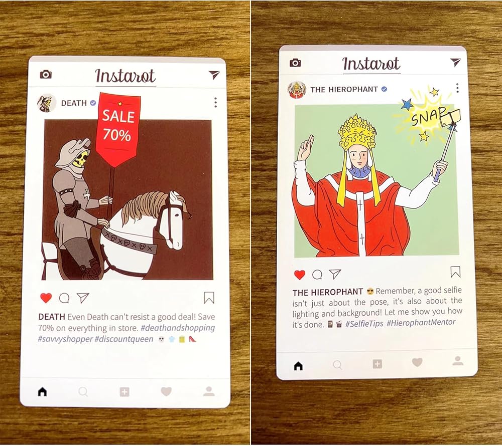 Immerse yourself in the world of Tarot with InsTarot's 78-card Social Lifestyle Caption Tarot Deck. Designed for the modern enthusiast, this deck captures the essence of social living through its captivating imagery and sparkling purple edges. Measuring 2.75 x 4.75'', each card is a masterpiece printed on 330 GSM arts card stock, ensuring a premium feel with durability. The deck comes in an exquisite two-piece rigid box, adding a touch of sophistication to your Tarot collection. The special edition includes three unique cards dedicated to A.E. Waite, Pamela Colman Smith, and the playful Happy Squirrel, paying homage to the pioneers of Tarot. While InsTarot doesn't include a guidebook, it follows the Rider-Waite-Smith (RWS) system, allowing for intuitive interpretations and personalized readings. The absence of a guidebook encourages a more personal connection with the cards, making each draw a unique journey into the Tarot's mysteries. This 1st edition deck, released in 2023, is more than just a set of cards; it's a collector's item, a piece of Tarot history. Embrace the opportunity to share and capture the moments of your Tarot journey with InsTarot's Social Lifestyle Caption Tarot Deck.