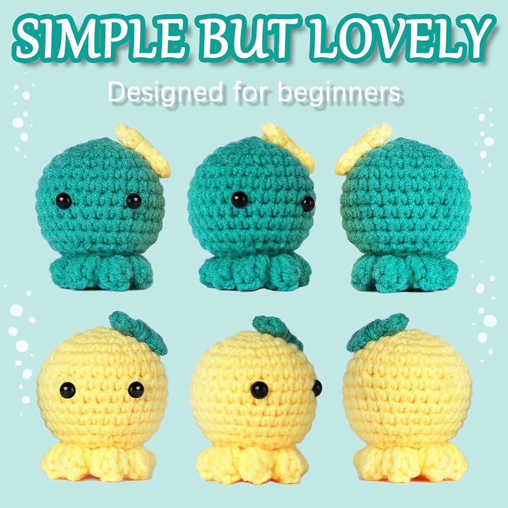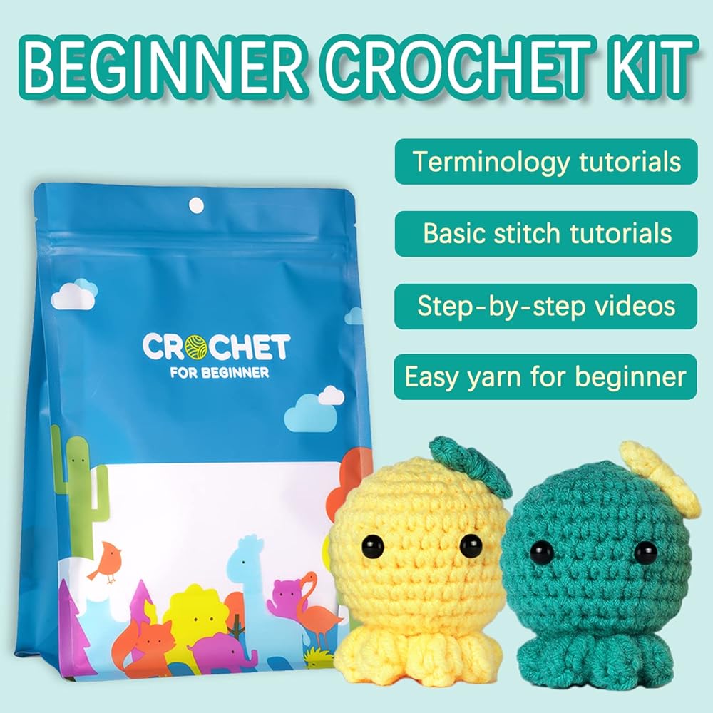 Beginner Crochet Kit, Boys and Girls Animal Woobles Set Art and Craft for Kids Adults Include Videos Tutorials, Yarn, Eyes, Stuffing, Hook 3PCS(Yellow Blue White) Suitable for Age 6 7 8 9 10 11 12