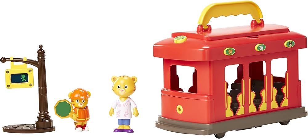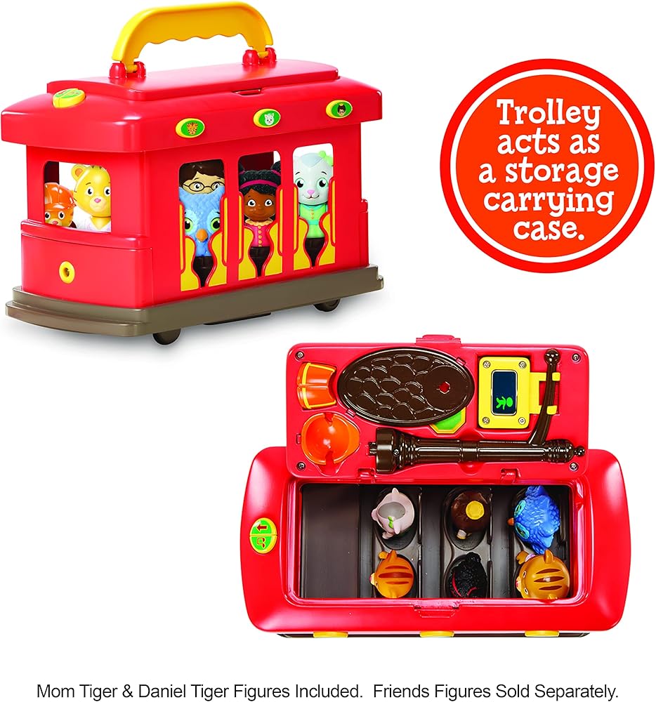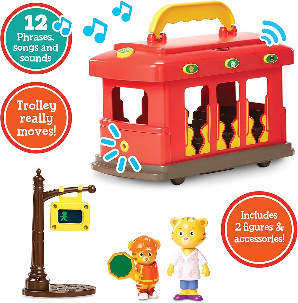 Daniel Tiger Deluxe Electronic Trolley - Join Daniel Tiger and his friends for a ride around the neighborhood on this deluxe working trolley! Load up Daniel Tiger, his mom, and his friends to go on a tiger-tastic adventure full of imagination! Trolley comes with 2 figures: Daniel Tiger and his mom. - At the push of a button, Trolley lights up and moves forward all by itself! Another button plays the Neighborhood Song and the Stop & Listen song. Trolley also has 6 character buttons with 2+ fun phrases each and includes Trolley sounds! - Open the trolley to place the characters inside; Trolley holds up to 6 figures. The trolley lid doubles as storage space for the play pieces, which include safety vest, hat, stop sign and street sign. - Your little Daniel Tiger fan will love to ride along with Trolley, Daniel Tiger, and friends!