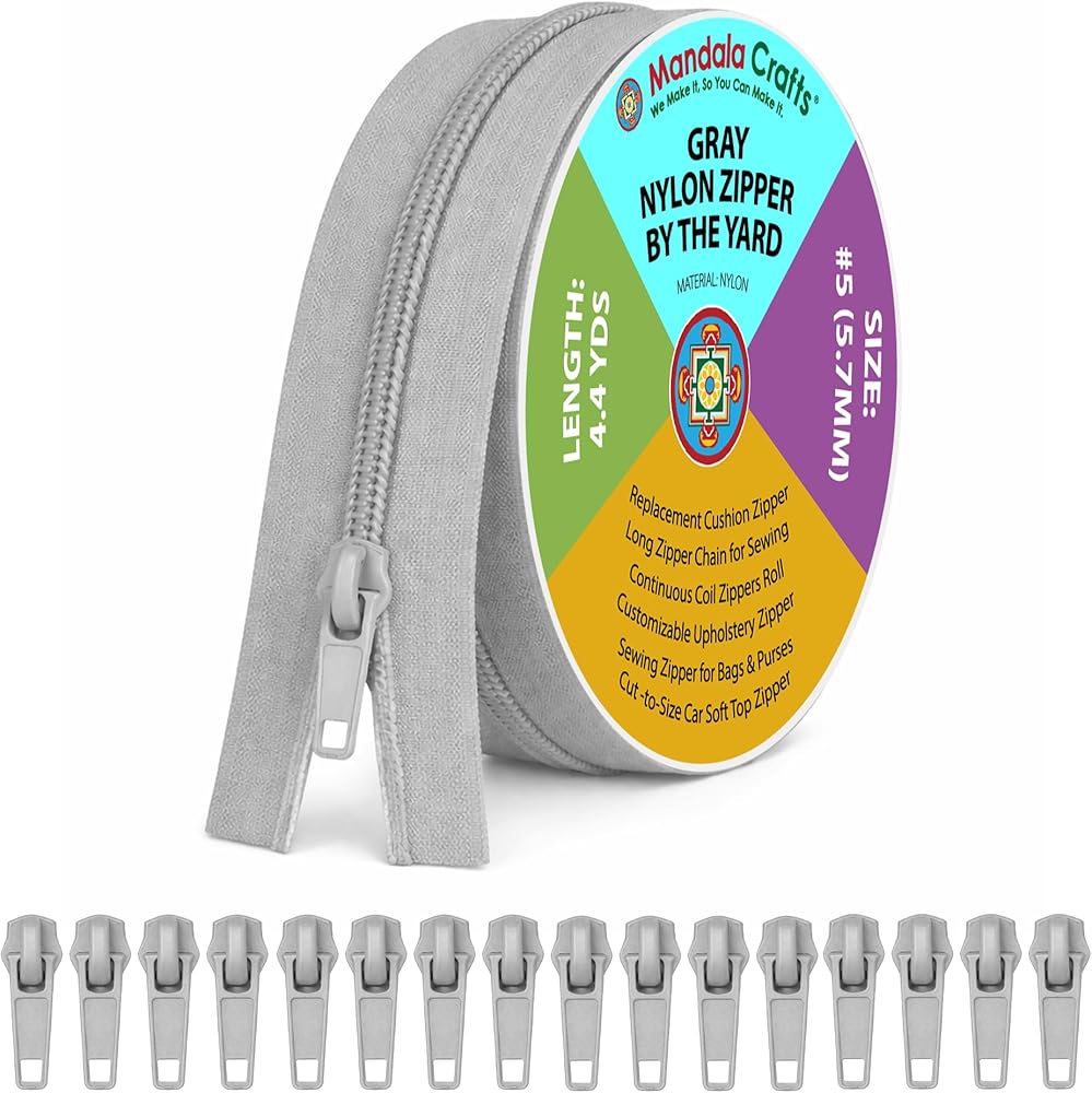Mandala Crafts Gray Long Zipper by The Yard – Coil Zipper by The Yard #5 – Continuous Zipper Roll for Sewing - Upholstery Zipper Chain with 16 Installed Sliders 4.4 Yards Long